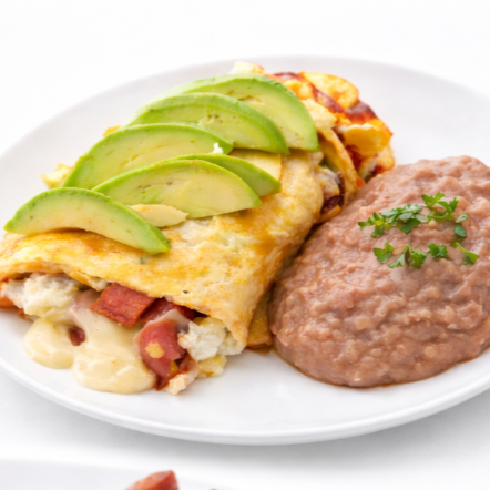 Omelette esponjoso preparado al momento, relleno de jamón y queso, acompañado con frijoles y tortillas calientes.