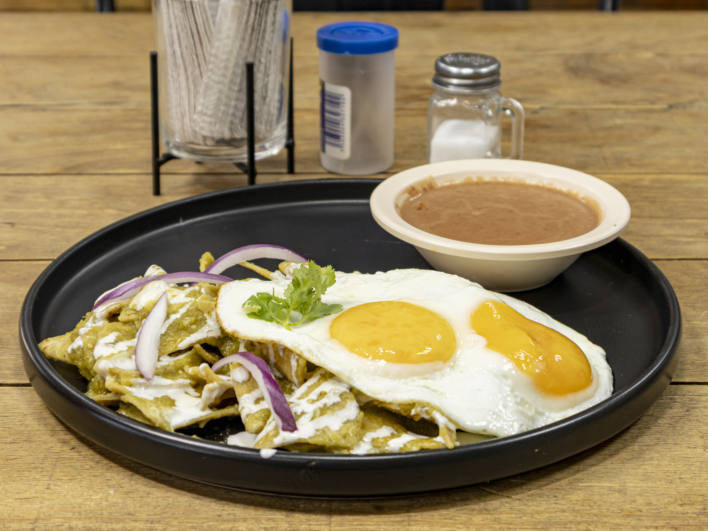 TOTOPOS BANADOS EN SALSA ROJA ACOMPANADO DE 2 HUEVOS ESTRELLADOS, FRIJOL, CEBOLLA, CILANTRO Y CREMA