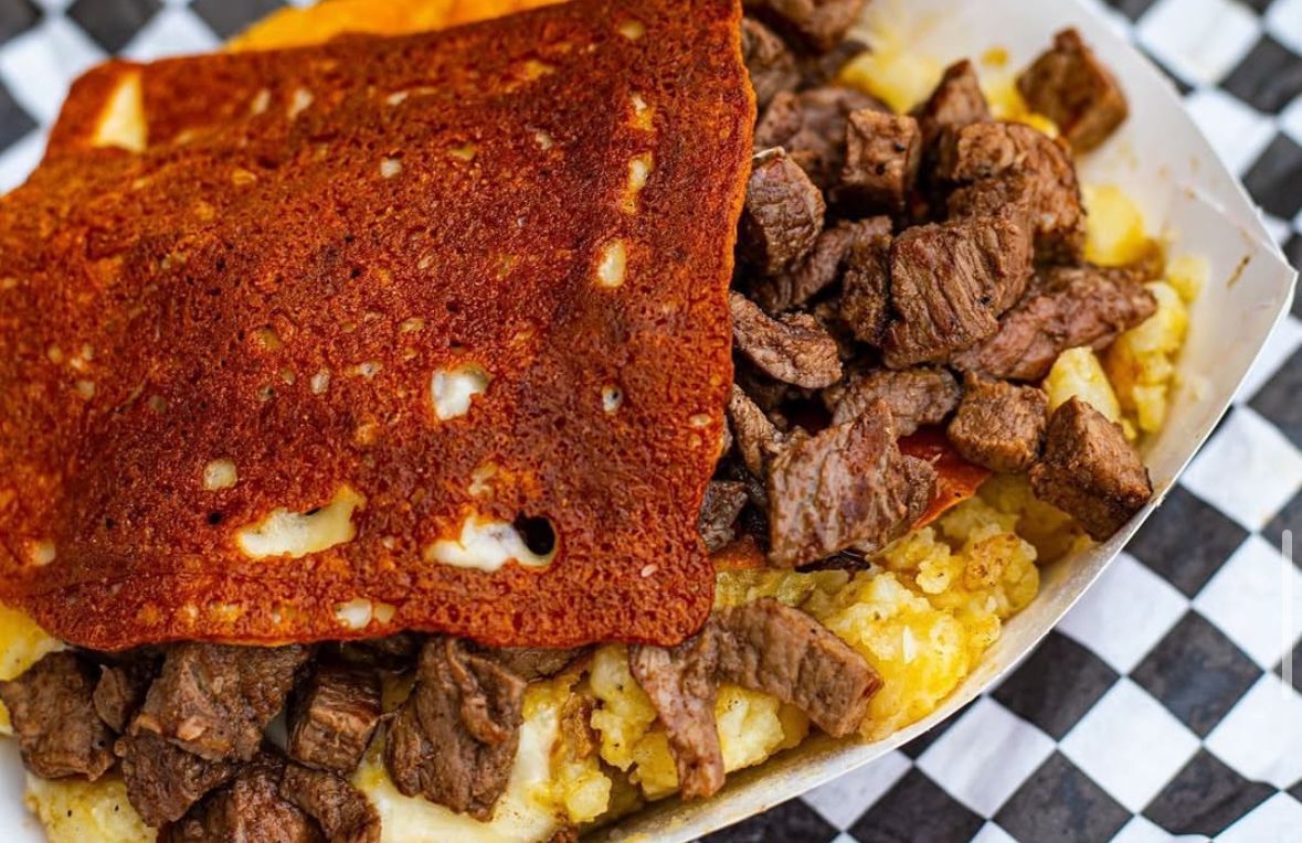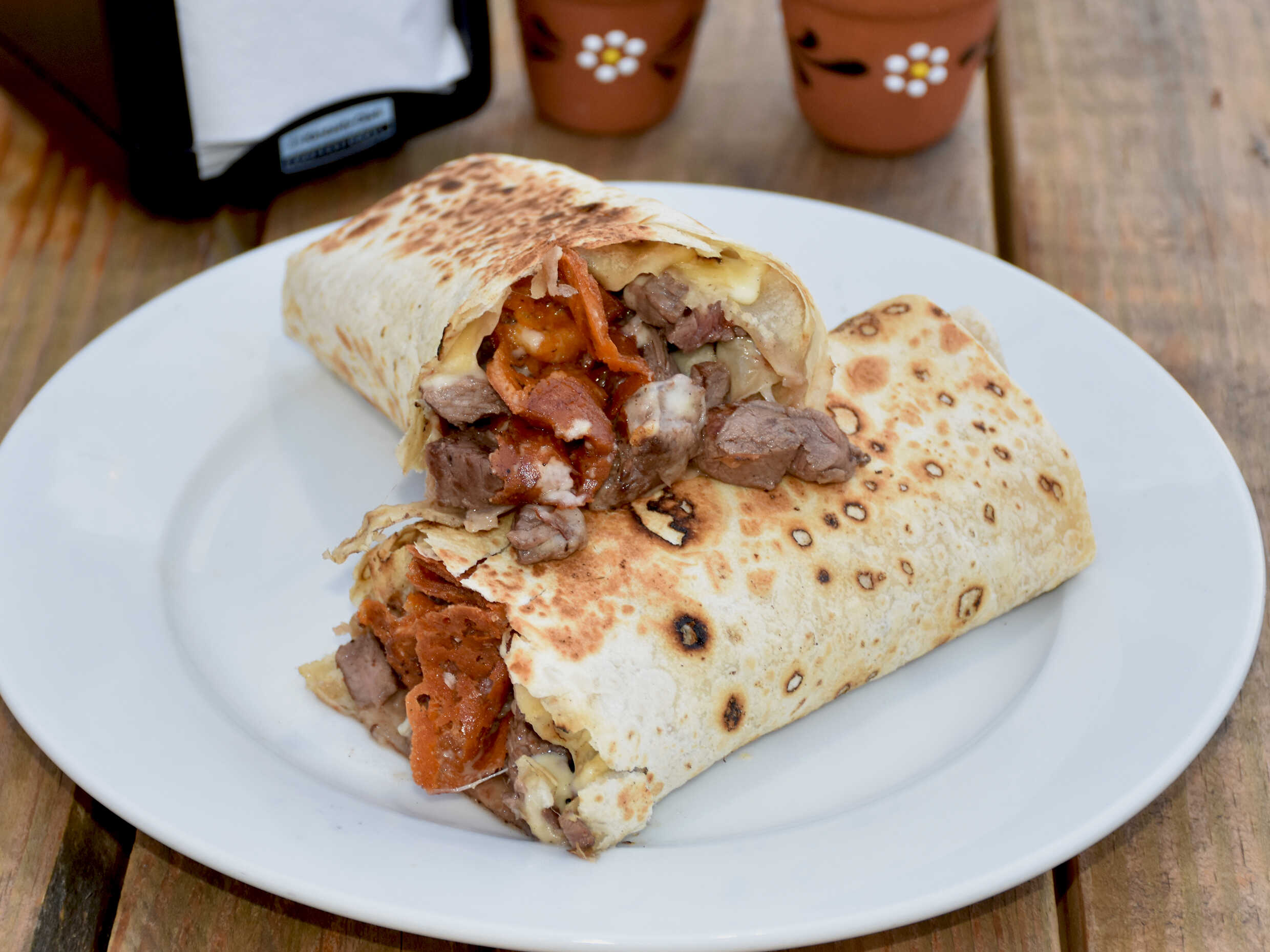 270 gr. con carne asada o asada al pastor, queso, frijoles y tortilla sobaquera.