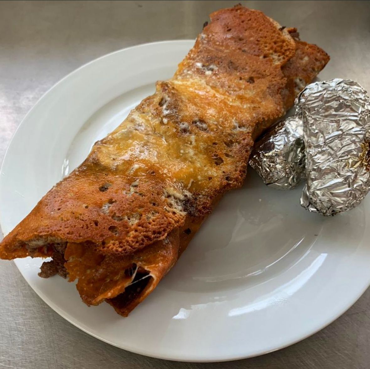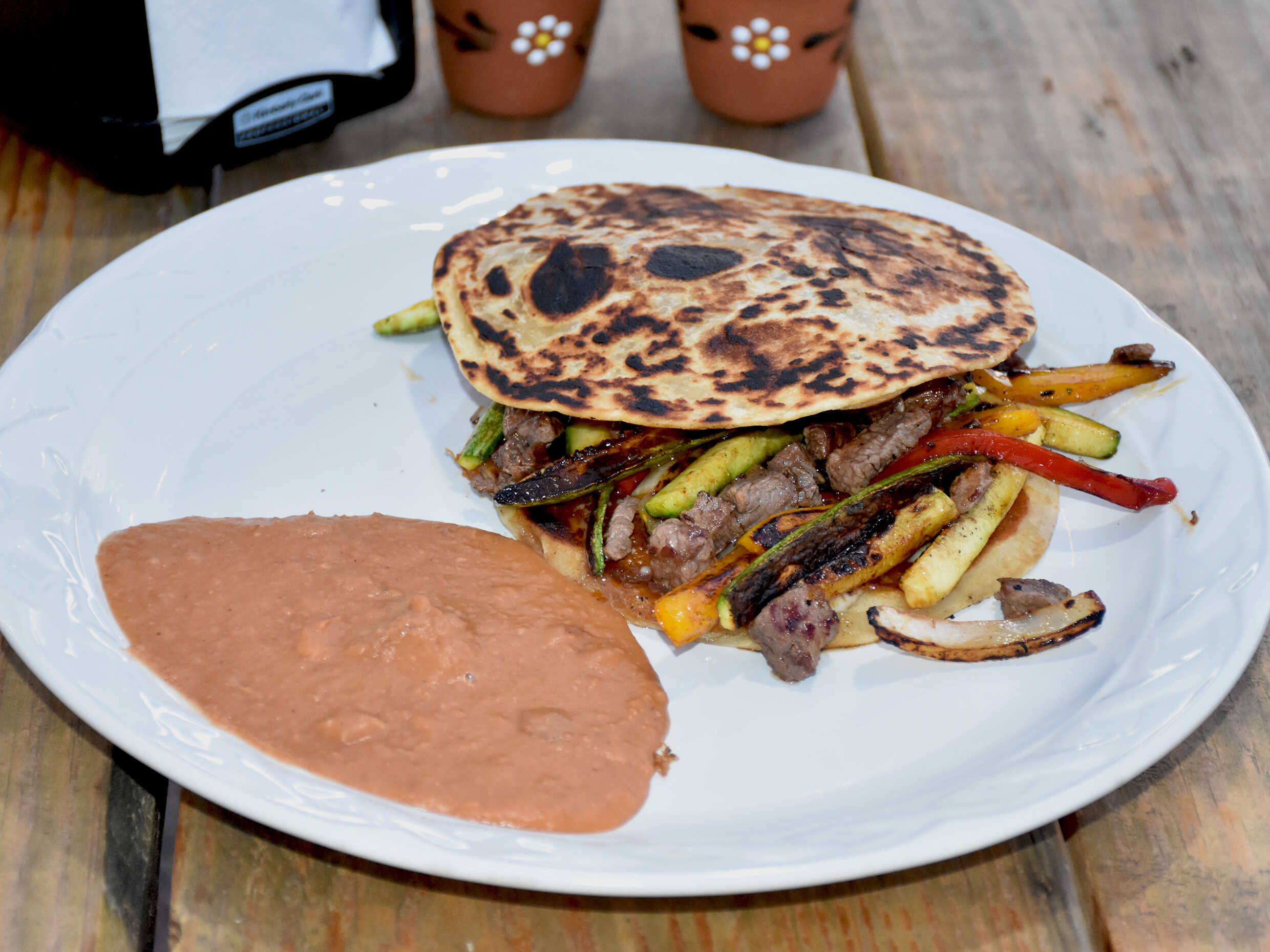 En 1 tortilla sobaquera con queso y carne de su elección, con frijoles aun lado.