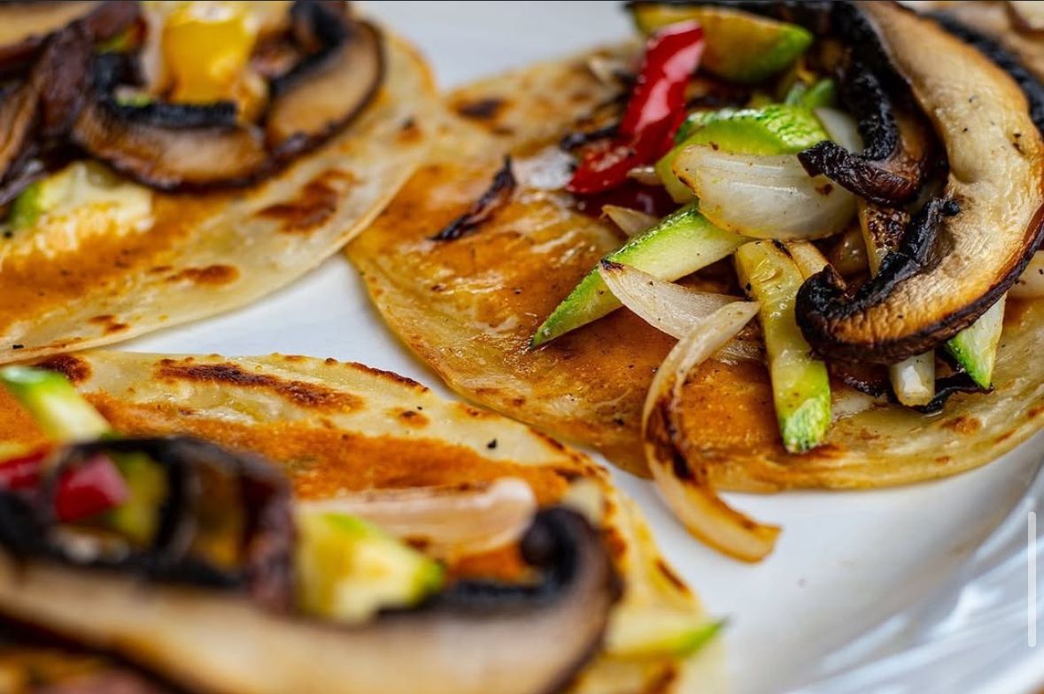 Orden de 3 tacos de portobello marinado con queso costrado y verduras al grill 190 gr. más 70 gr. de carne asada, pollo o adobada.
