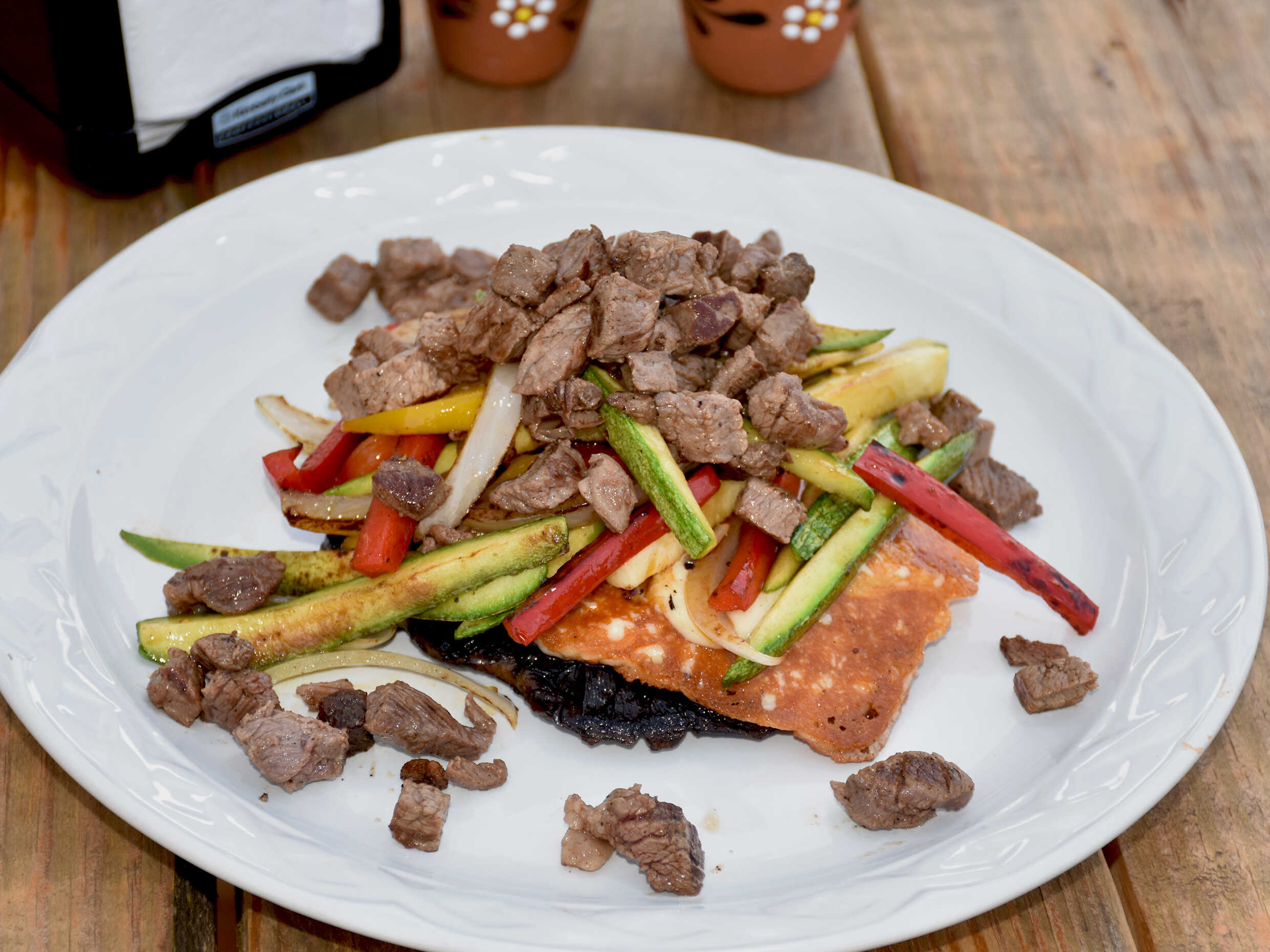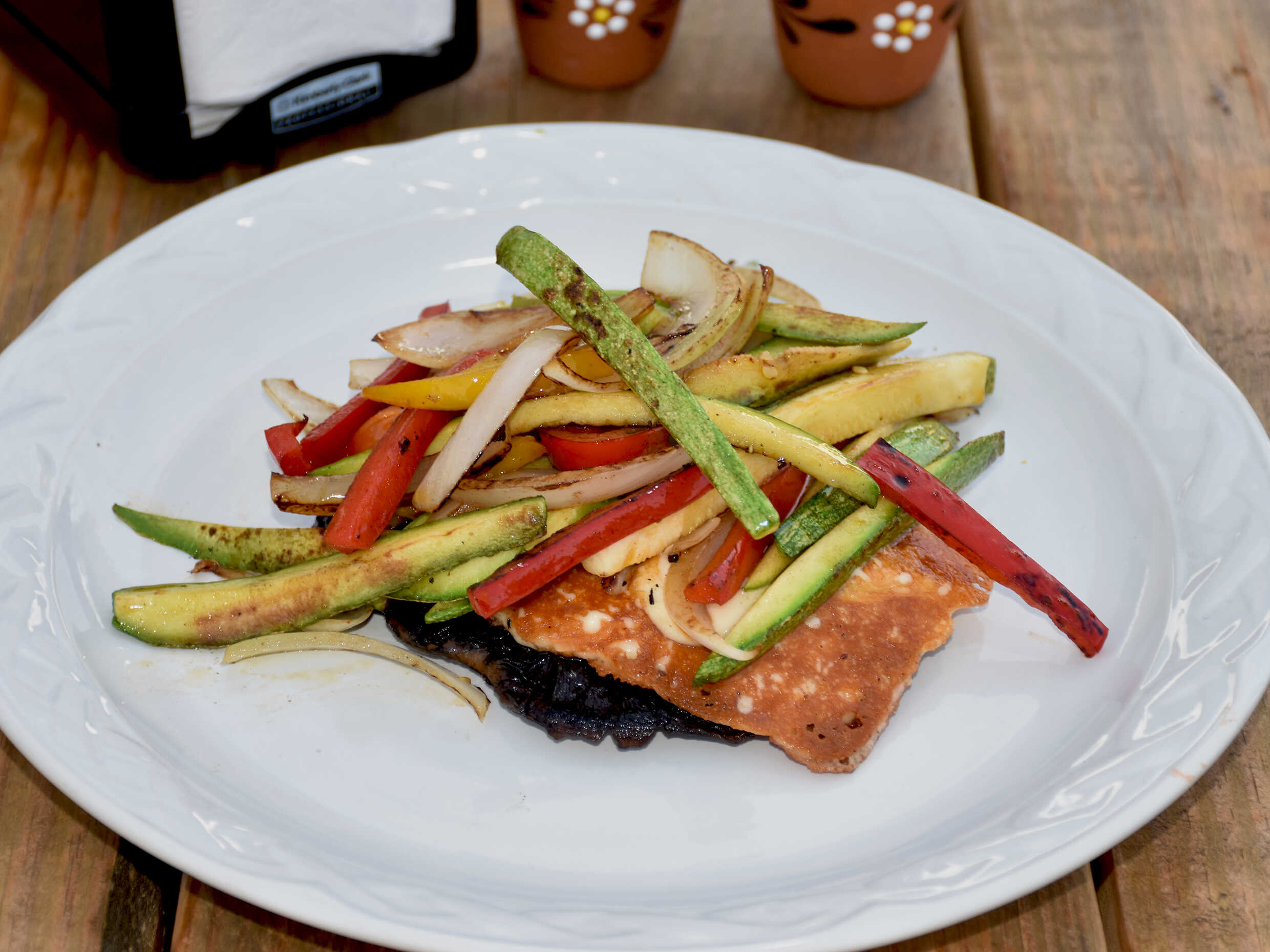 190 gr. total, portobello asado con queso costrado y mezcla de pimientos morrones, calabacitas, champiñones todo sazonado y a la parrilla.