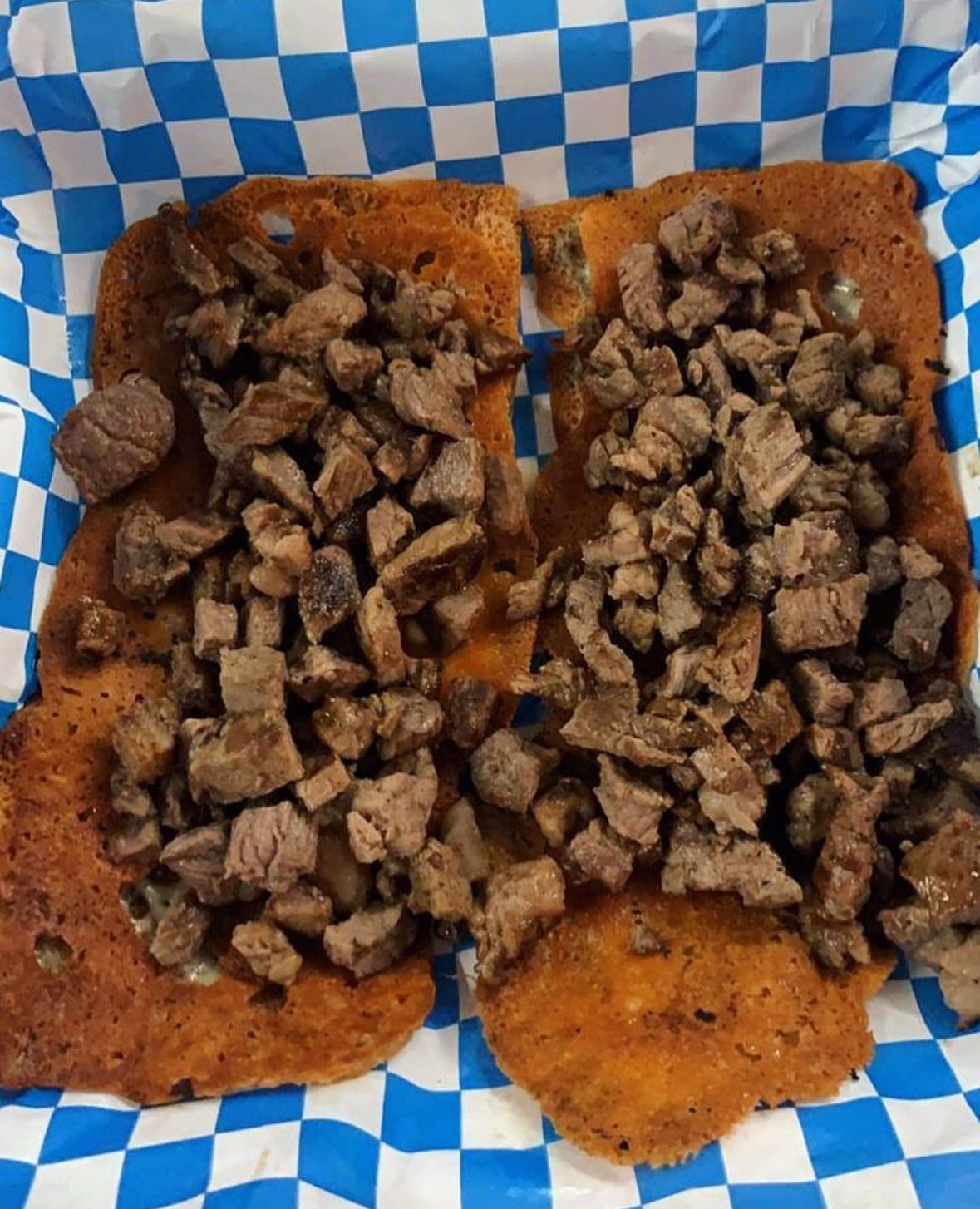 Tostada de maíz con queso y carne, carne asada, pollo o adobada.
