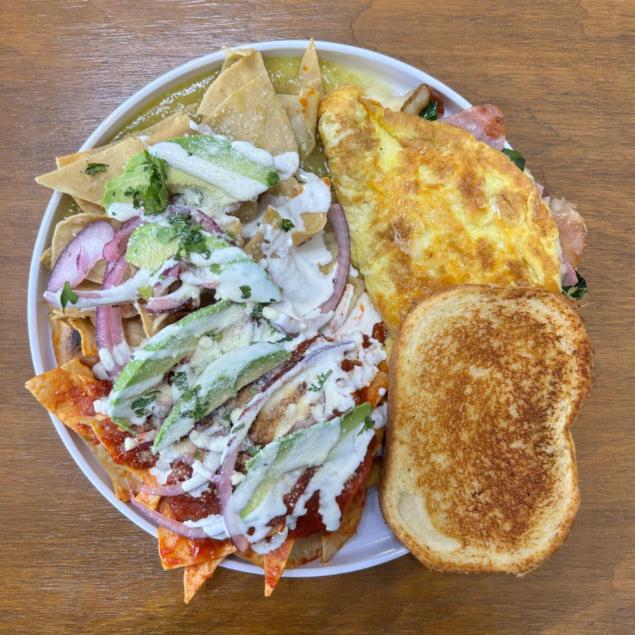 Chilaquiles bañados en salsa roja, verde o mixta, acompañados de un esponjoso omelette relleno de dos ingredientes a elegir y frijoles de la casa.