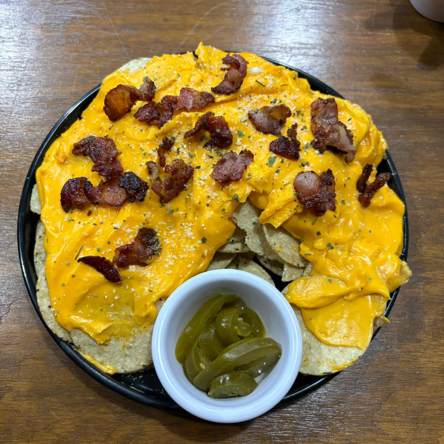 Nachos bañados de queso amarillo, acompañado de trozos de tocino y chile jalapeño.