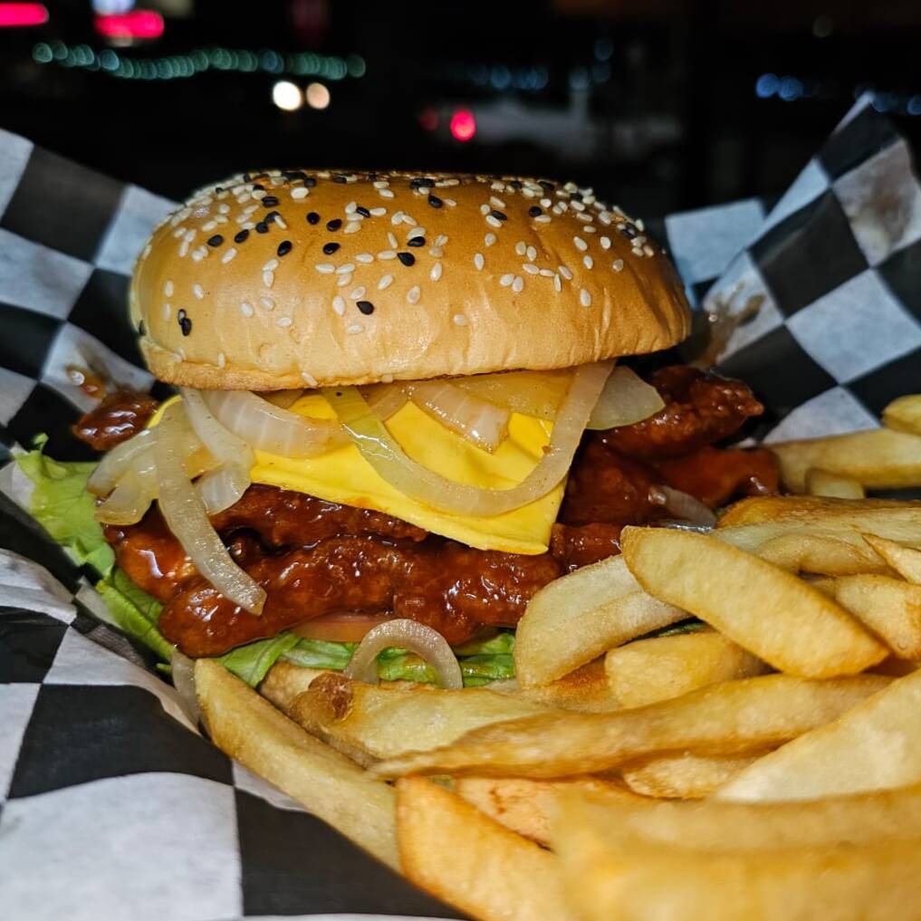 Pan, 170 gr. de pollo en tiras empanizado y frito bañado en salsa de su elección, queso tipo americano, cebolla caramelizada, lechuga, tomate. 170 gr. de papas a la francesa, 2oz. de aderezo de la casa y kétchup.