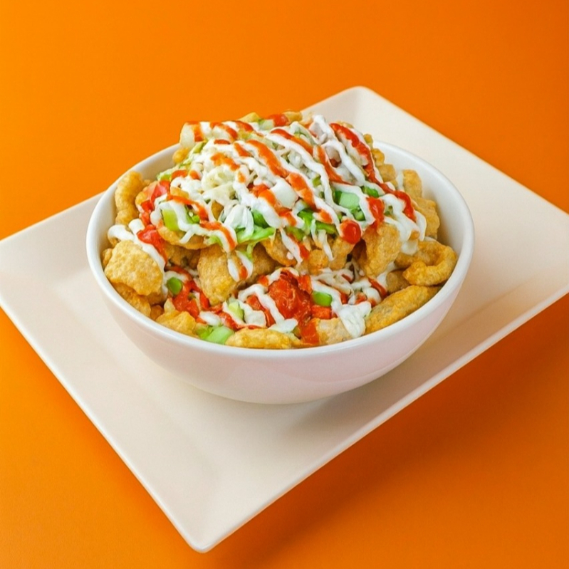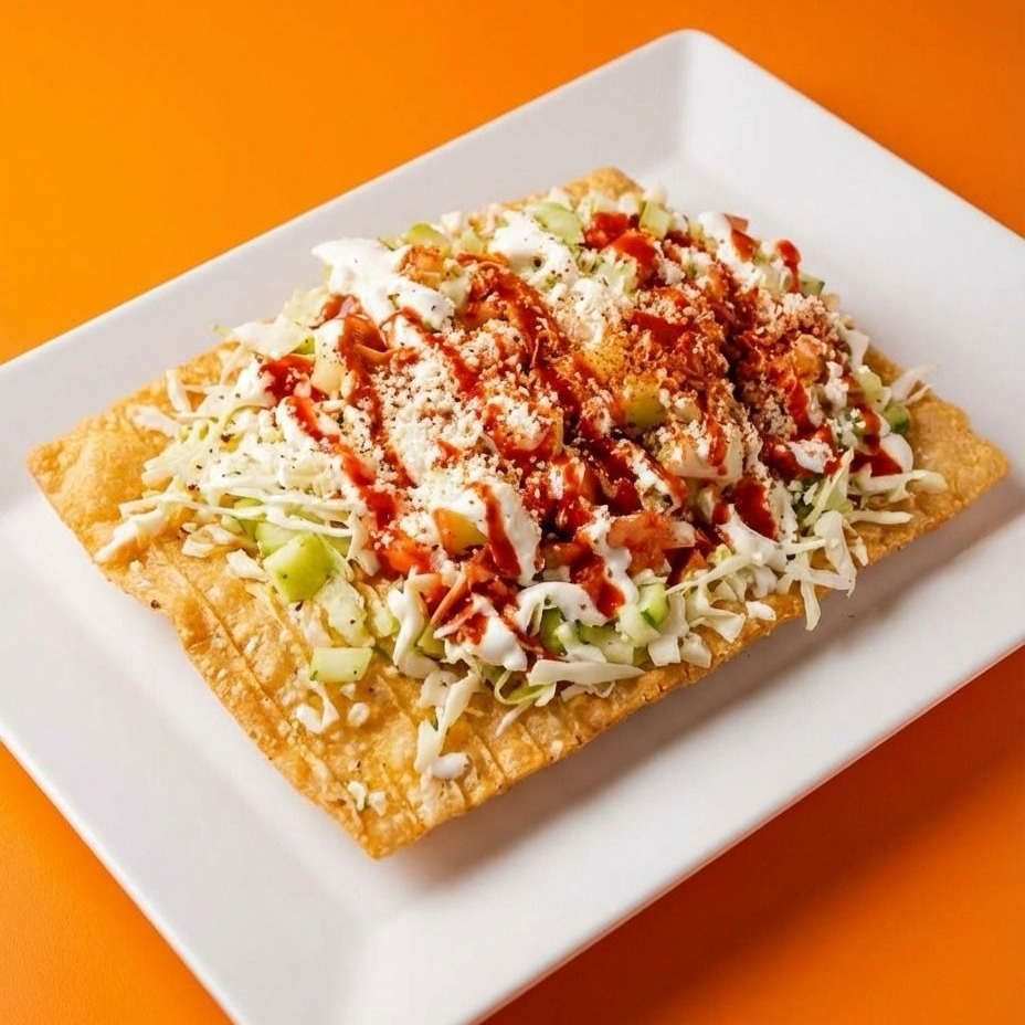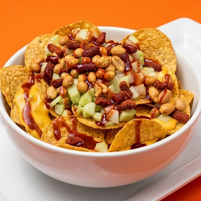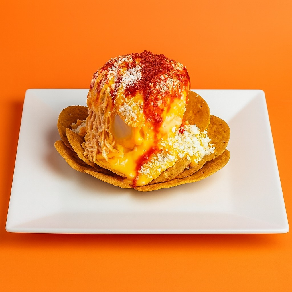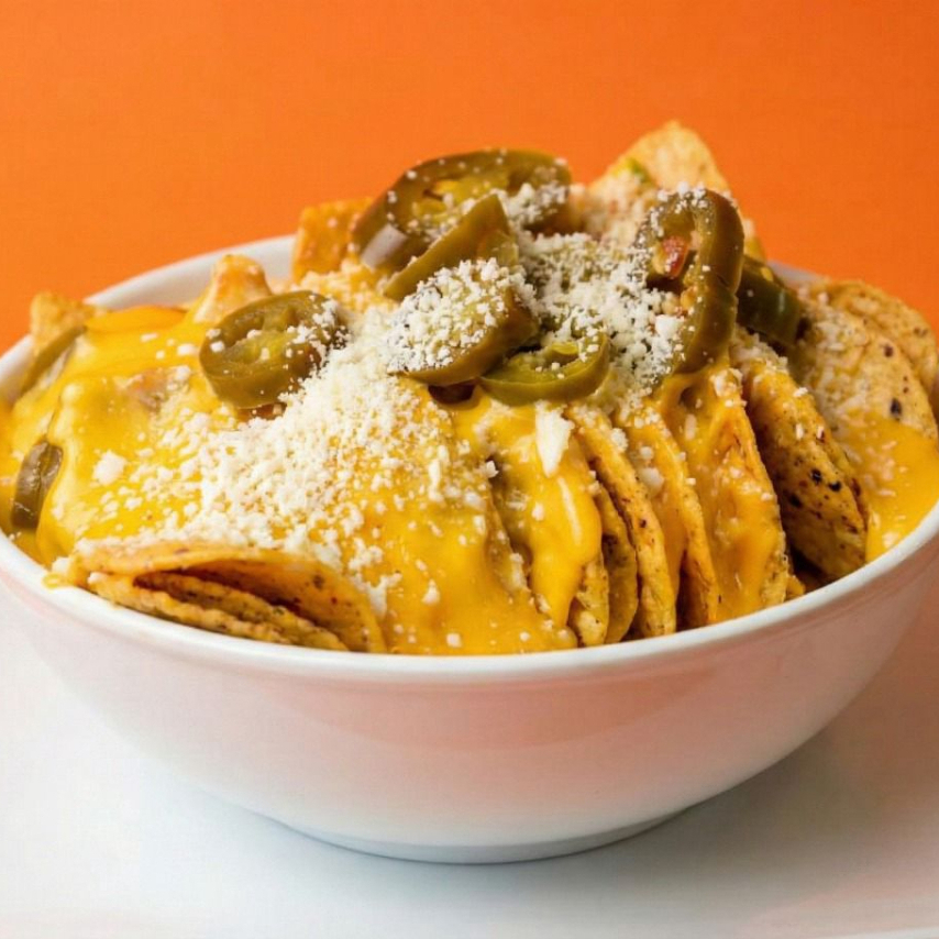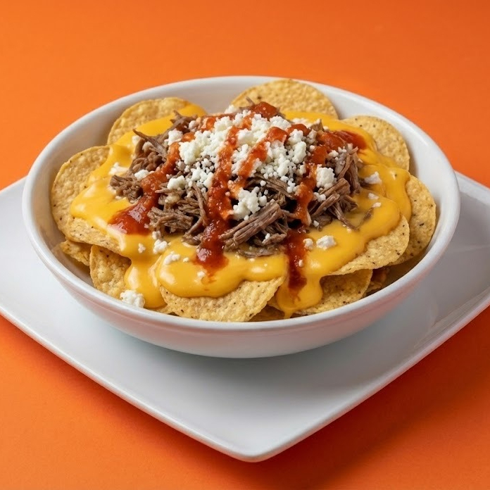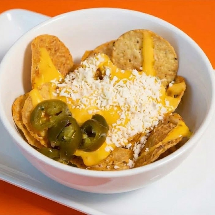 Tostitos preparados con queso amarillo, carne de res, queso blanco y salsa.