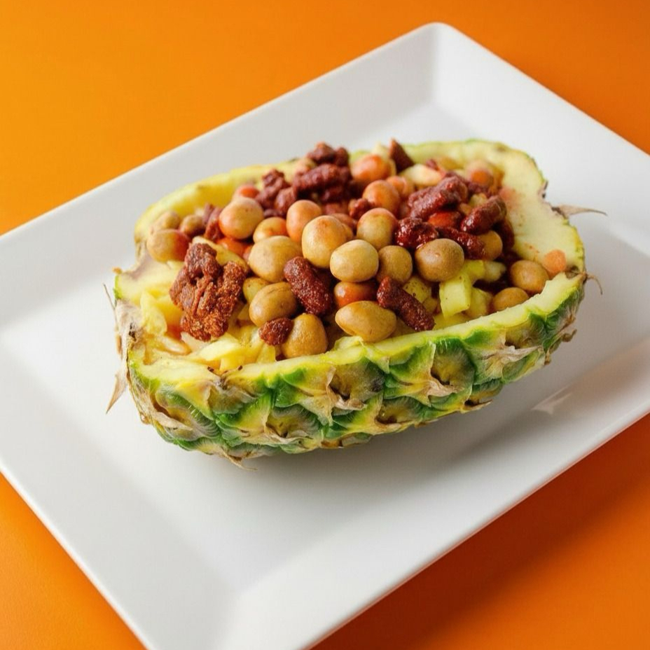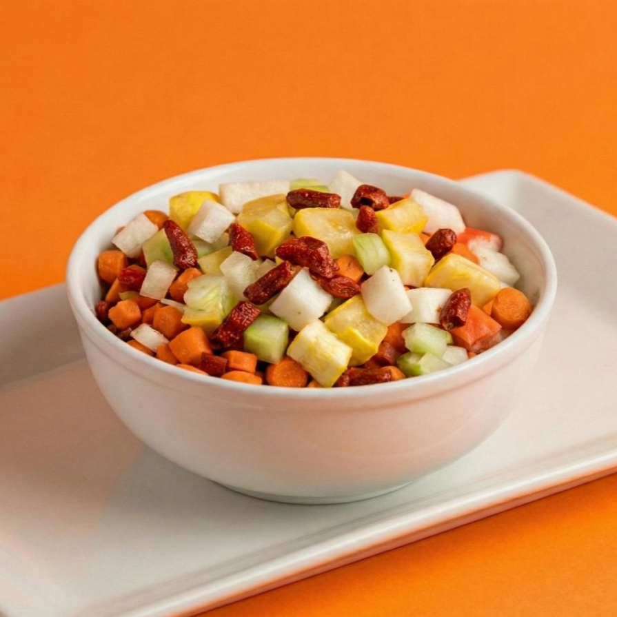 Jícama, pepino, piña, cacahuate, rielito, clamato, chamoy.