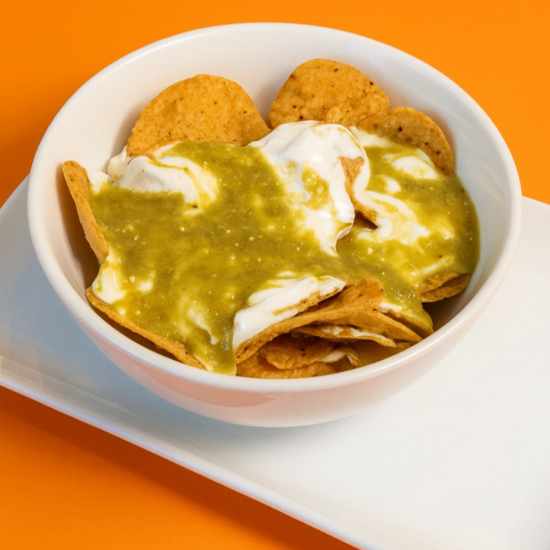 Tostitos con queso amarillo, queso blanco y salsa verde.