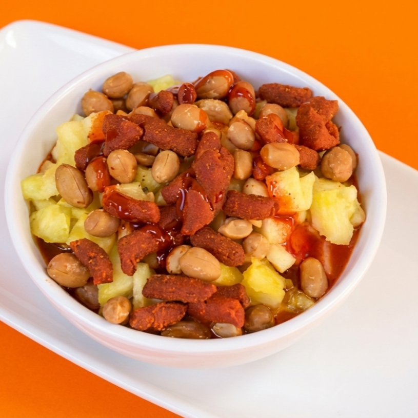 Piña, cacahuate, rielito, clamato y chamoy.
