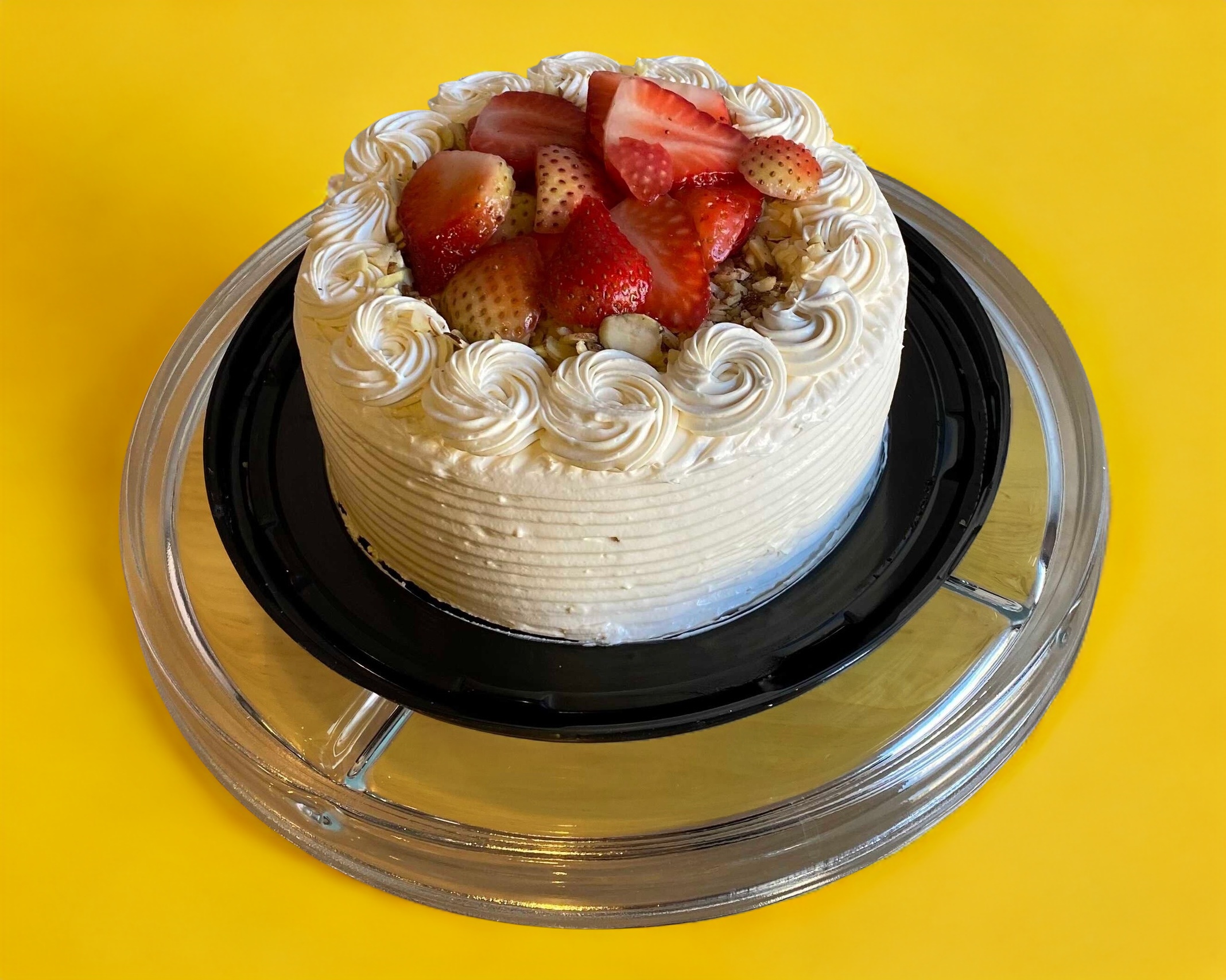 Pan de vainilla salseado con jugo de fresas relleno de pudín de vainilla con cobertura de queso crema con fresas naturales y almendras trituradas.
