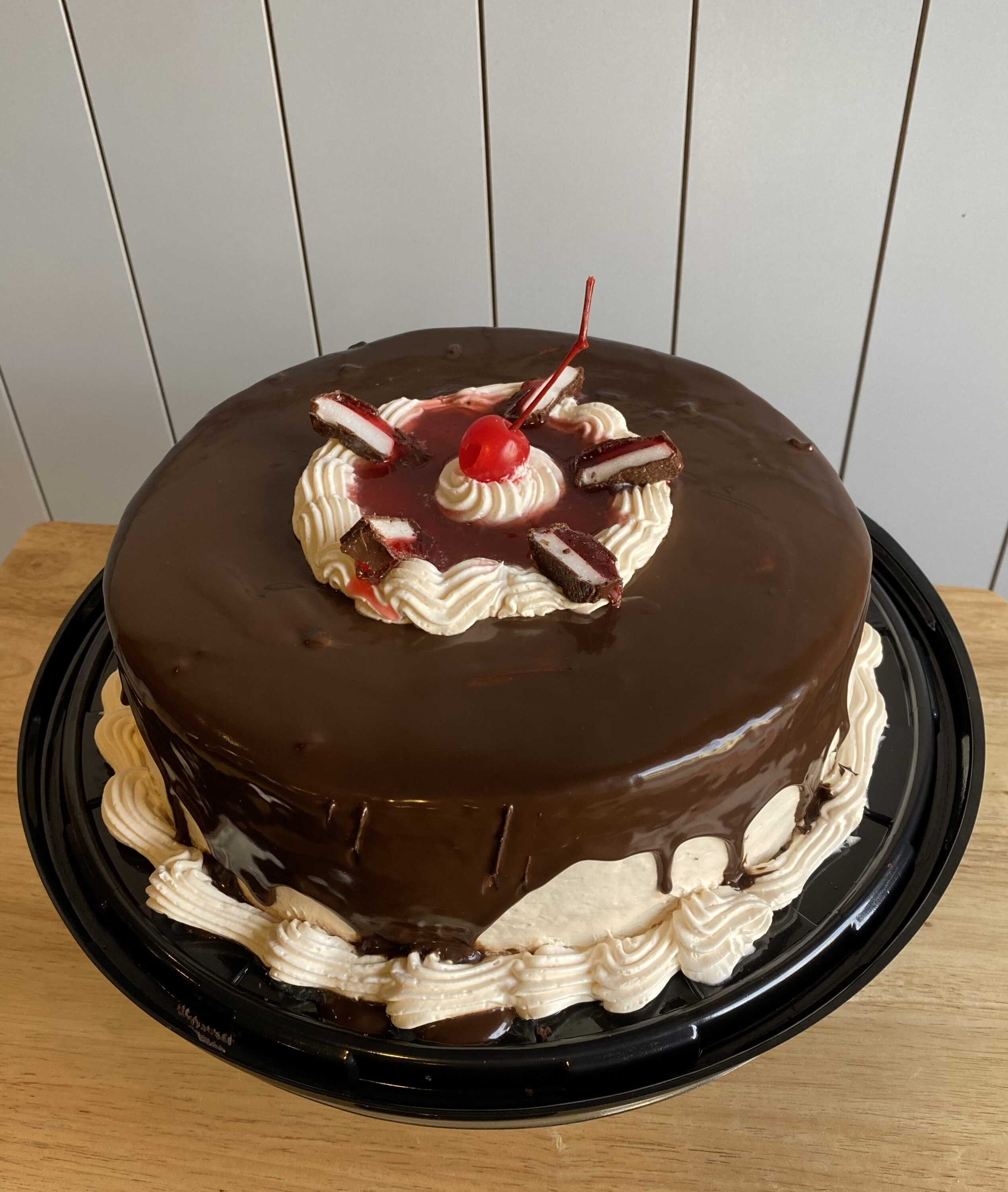 Pan de chocolate relleno de queso crema, mermelada y bombones con cubierta de queso crema y chocolate con trozos de bubulubu.