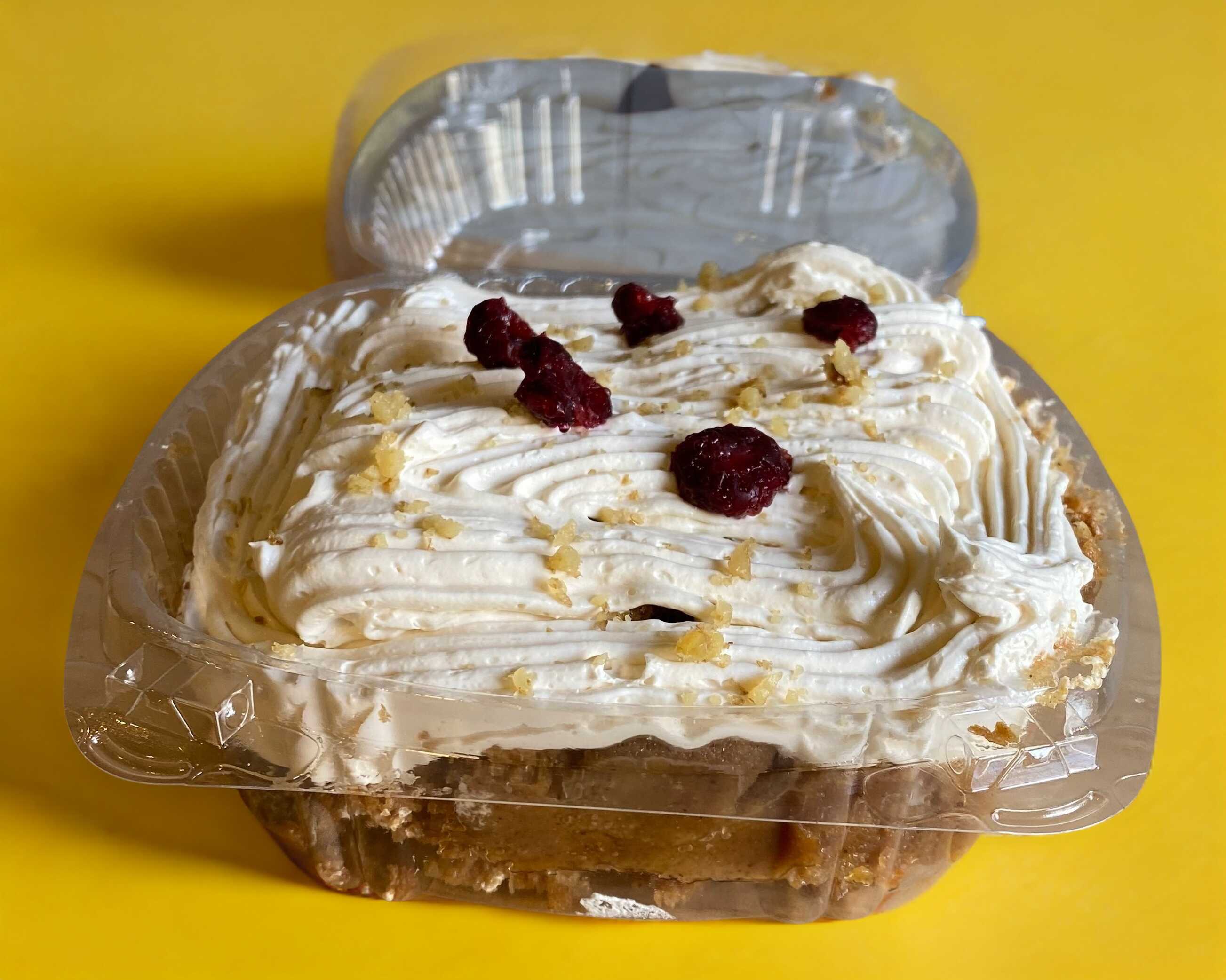 Pan de zanahoria con arandanos, trozos de piña y nuez cubierto de queso crema con trozos de nuez de castilla y arandanos.