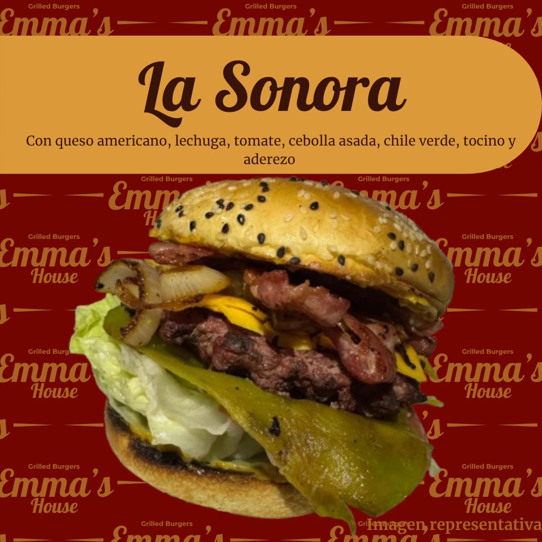 Carne de diezmillo de res, doble queso, lechuga, tomate, cebolla, chile verde, cebolla asada, aderezo especial, tocino y papas a la francesa