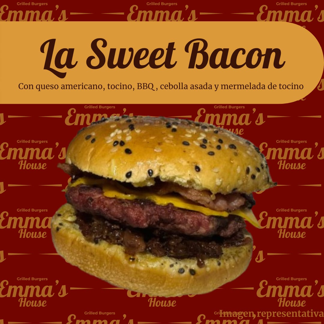 Carne de diezmillo de res, mermelada de tocino, salsa BBQ, doble queso, cebolla asada y papas a la francesa