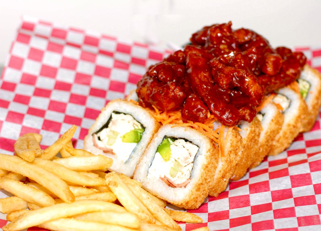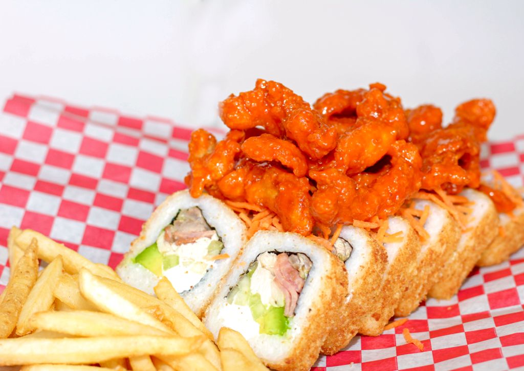 Sushi con carne de res, pollo, cangrejo (surimi), aguacate, philadelphia y alga, arriba boneless bañados en salsa de tu elección. Incluye aderezo ranch, aderezo chipotle, salsa soya. (No incluye papas, se venden por separado).