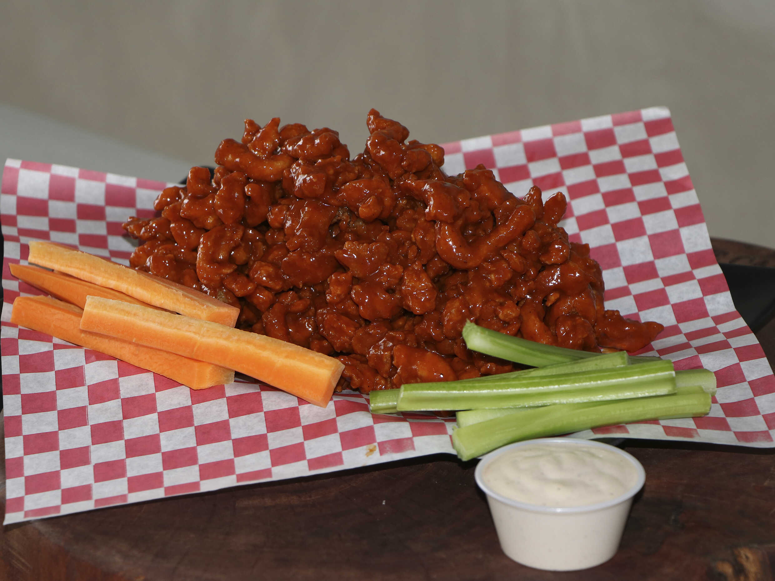 500 g de puro Pollo, empanizado y bañado en 1 o 2 de tus salsas favoritas, acompañado de aderezo ranch de la casa, bastones de zanahoria y apio.