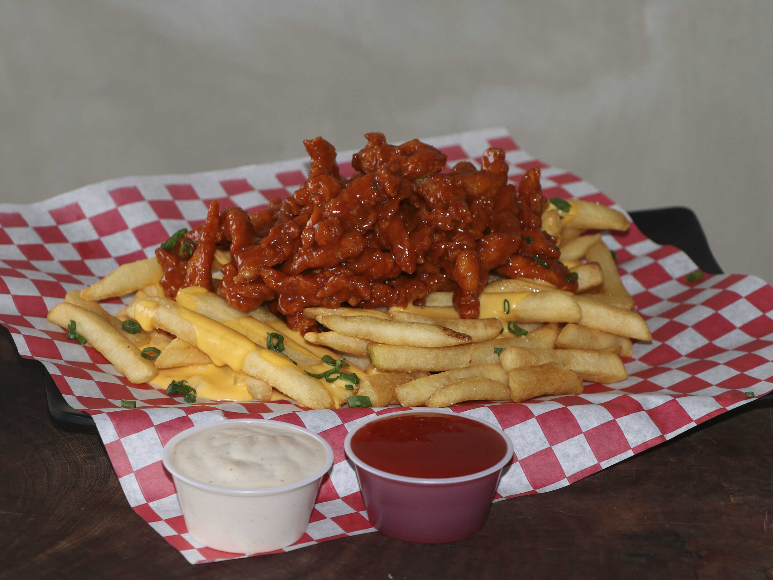 Papas a la francesa bañadas en queso, arriba boneless en tu salsa favorita y cebollín, acompañadas de cátsup y aderezo ranch de la casa.