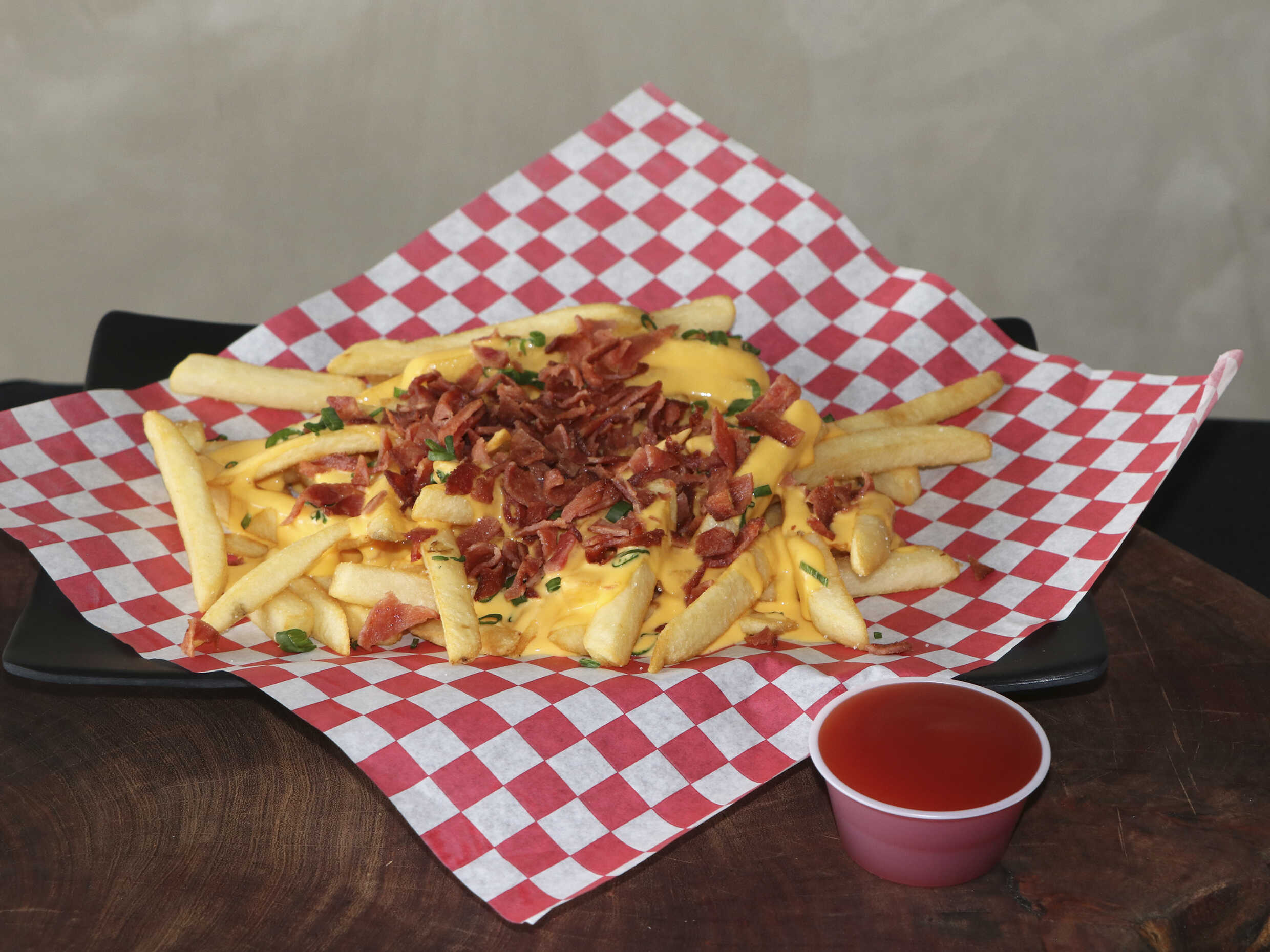 400 gr de Papas a la francesa bañadas en queso, tocino y cebollín