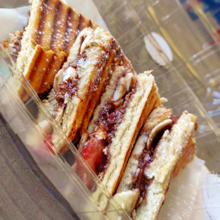 Panini con crema de cacahuate, almendra o Nutella, plátano, fresa y coco rayado.