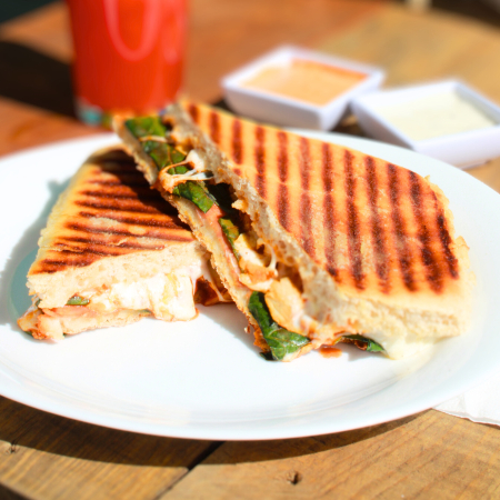 Pan chapata, pollo en salsa búfalo (65g), queso queso mozzarella, espinaca, jamón de pavo, crema tipo ranch.
