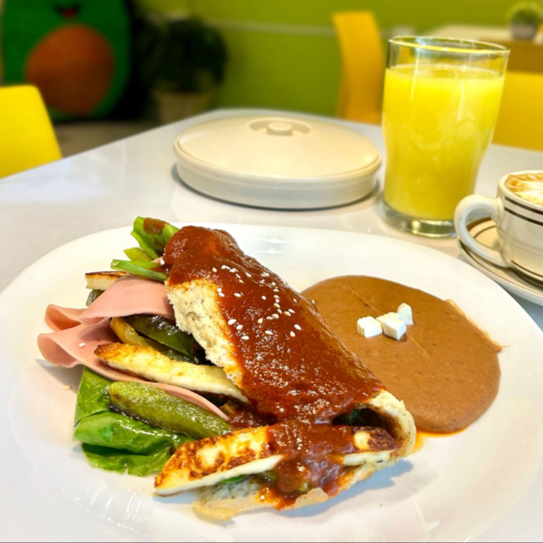 Pan chapata, chilorio de cerdo, queso philadelphia, aguacate y jamón.