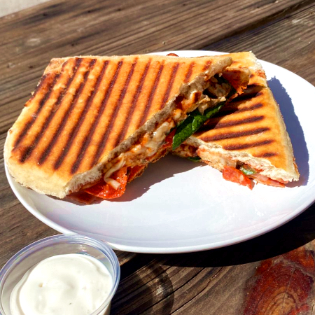 Pan chapata, pollo (65g), jamón de pavo, queso manchego, espinacas, pimientos, crema de chipotle.