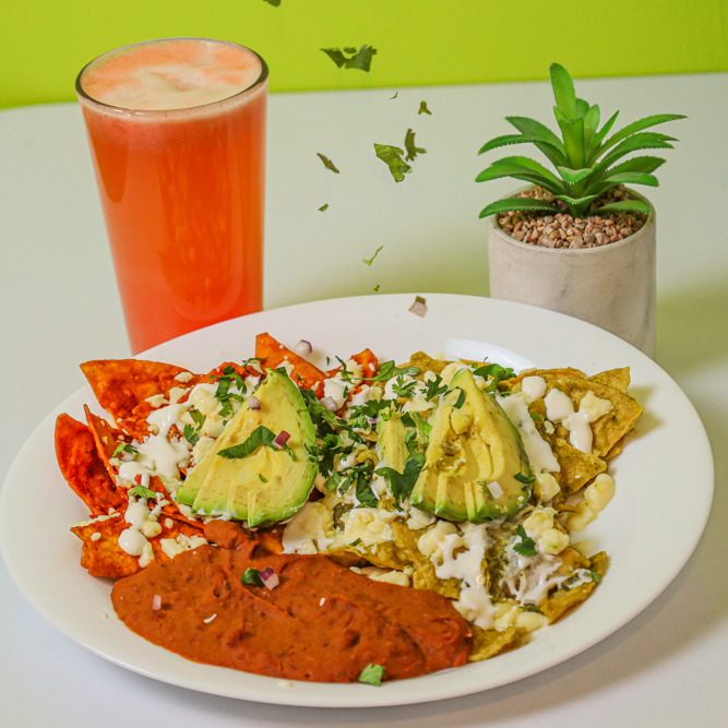 Chilaquiles con la salsa de tu preferencia servidos con queso gratinado, acompañados de cilantro, cebolla, media crema y una orden de frijoles de la casa.