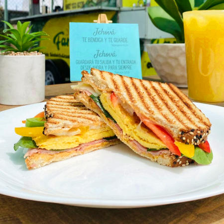 Pan multigrano, dos huevos, jamón de pavo, queso manchego, espinaca y pimientos.
