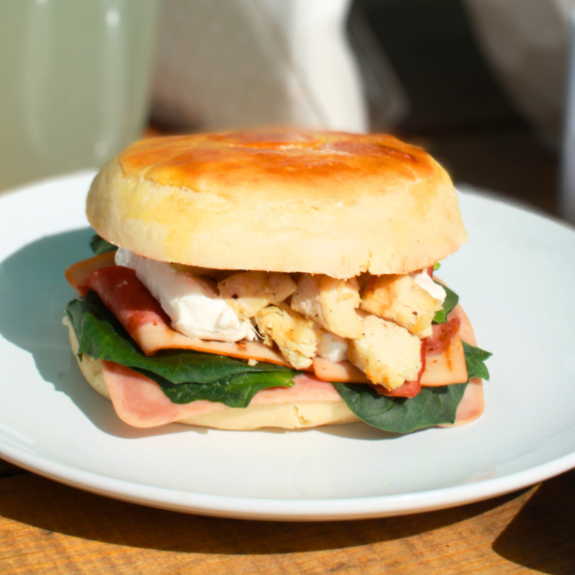 Bísquet de mantequilla, pollo, jamón de pavo, espinaca, queso Philadelphia, tocino ahumado, crema de chipotle.