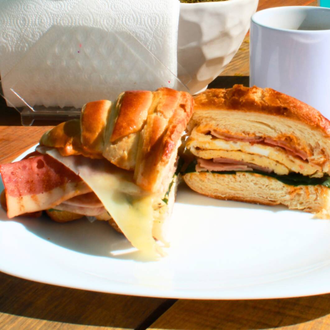 Croissant de mantequilla, omelette de huevo, jamón de pavo, tomate, queso manchego, tocino de pavo, espinaca, crema de chipotle.