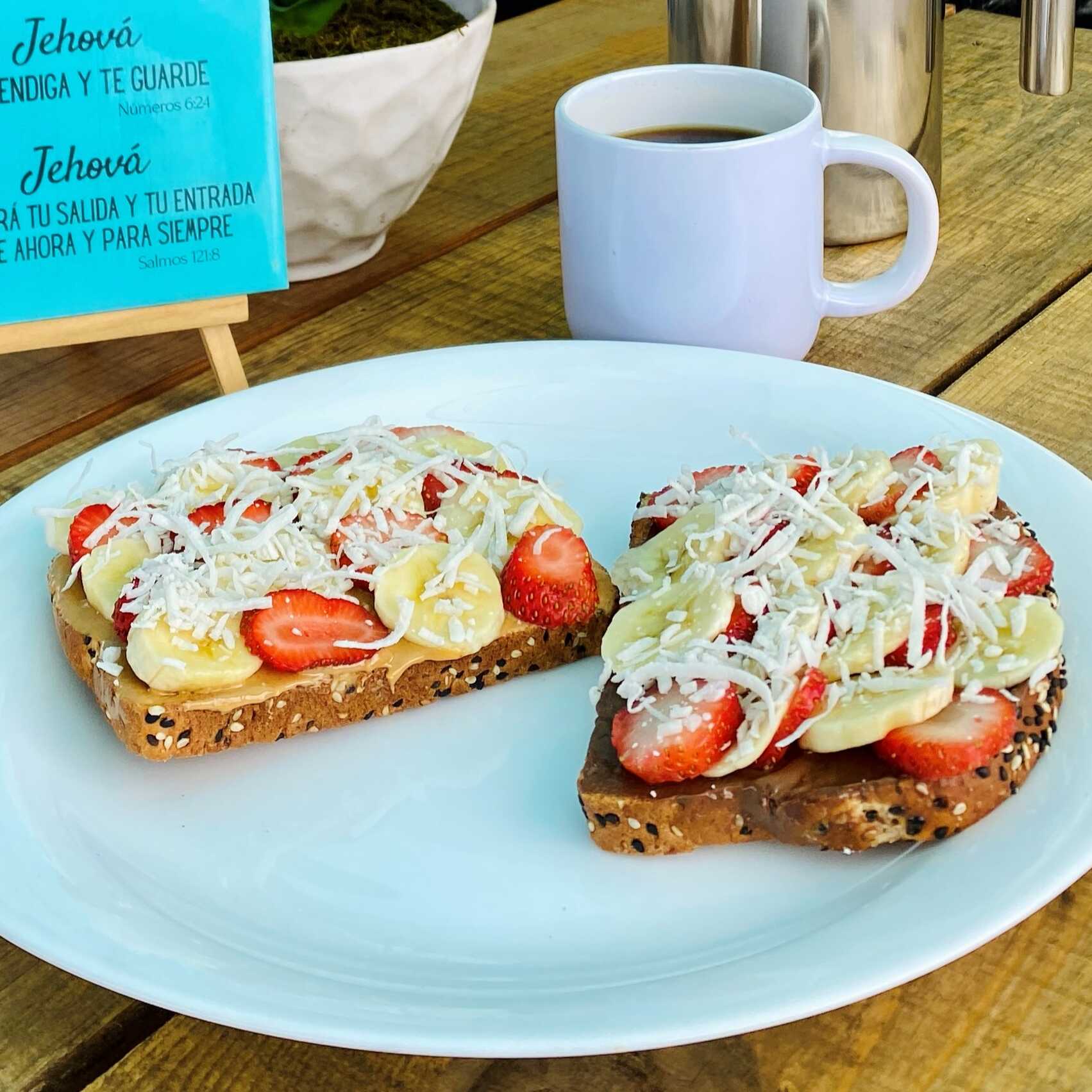 Pan tostado con crema de cacahuate, almendras o nutella, plátano, fresa y topping de coco rayado.