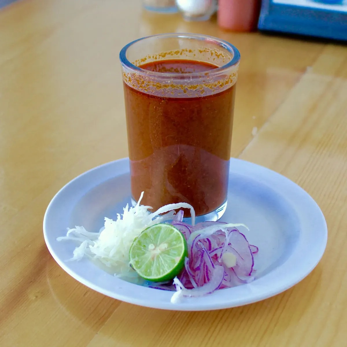 Delicioso caldo de cahuamanta, acompañado de repollo, tortillas y totopos