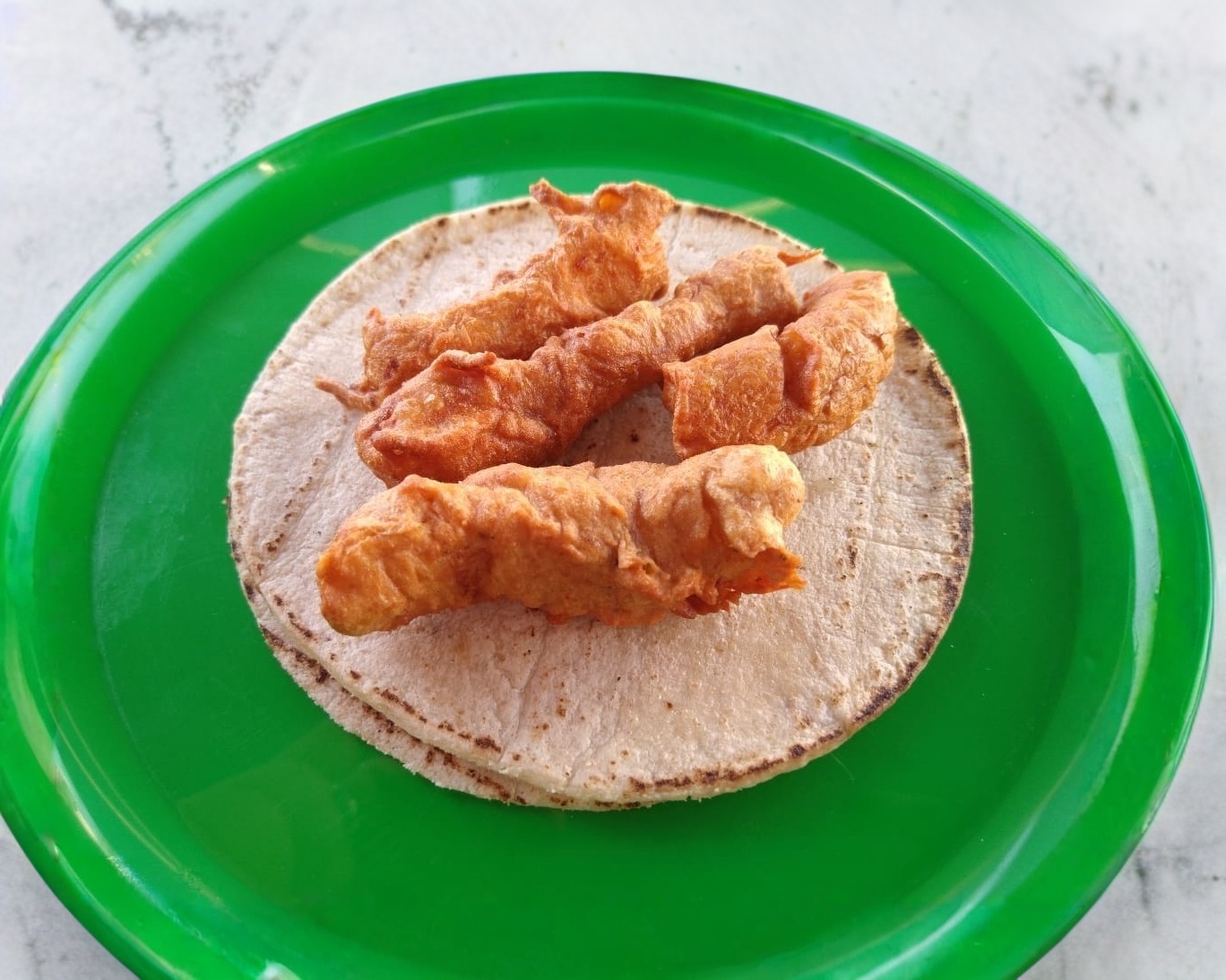 Delicioso Taco de pescado capeado, todos los tacos incluyen salsa bandera, ensalada de col, aderezo de cilantro y aderezo de chipotle