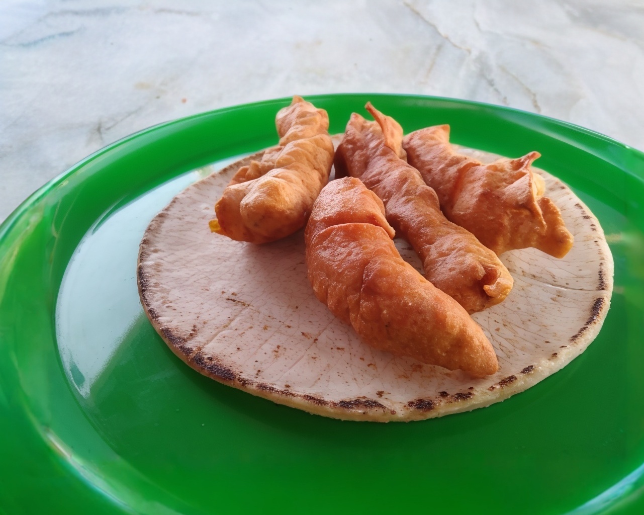 Chile caribe capeado, relleno de queso, con camarón, todos los tacos incluyen salsa bandera, ensalada de repollo, limones, aderezo de chipotle y aderezo de cilantro.