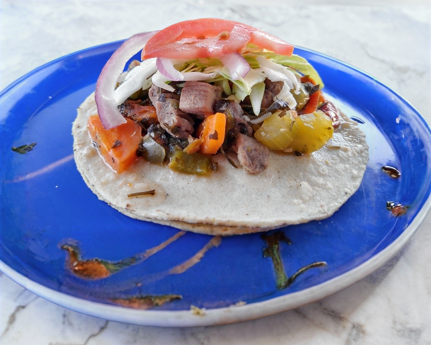 Taco de cahuamanta, incluye repollo, tomate, cebolla morada y limón