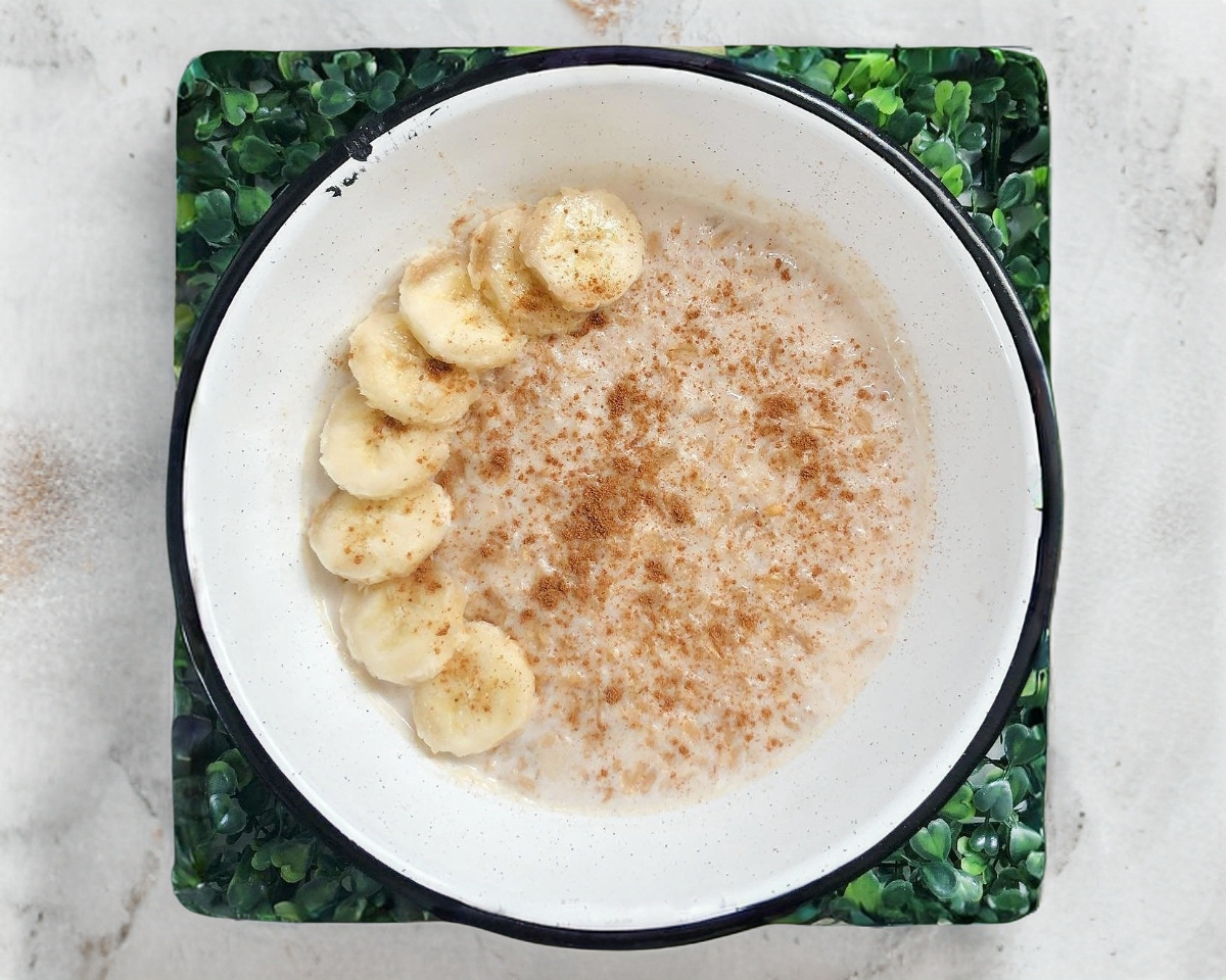 Avena cocida, cacao, canela y plátano.