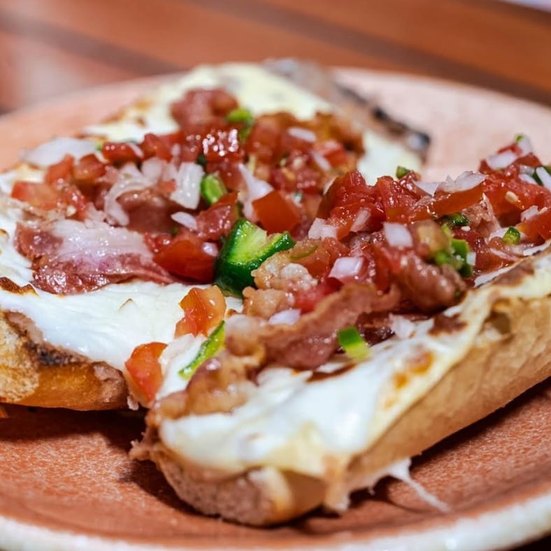 Pan virginia, 2 huevo estrellado, chorizo, aderezo de frijol, cebolla caramelizada, tocino y aguacate.