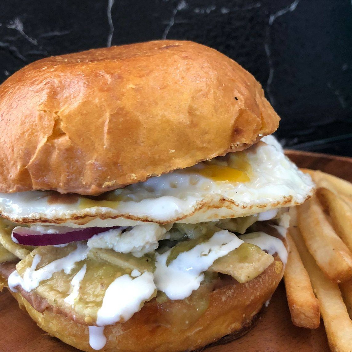 Pan virginia, chilaquiles verdes, crema, queso, huevo estrellado, cebolla morada y aderezo de frijol.