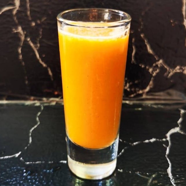 Shot de jugo naranja, cúrcuma, zanahoria y pimienta cayena.