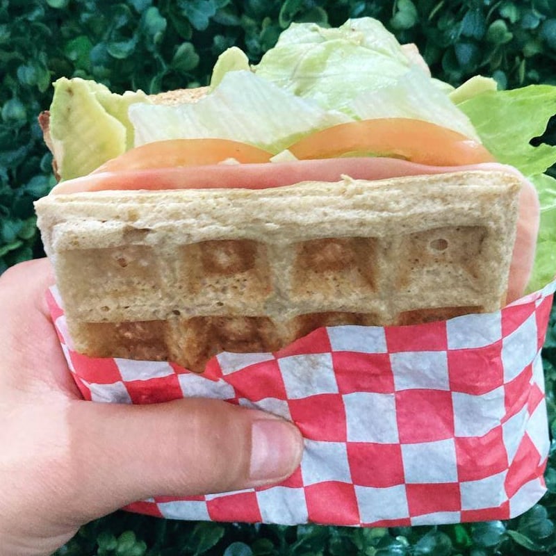 Sandwich de waffle, jamón, queso manchego, queso amarillo, lechuga y tomate.