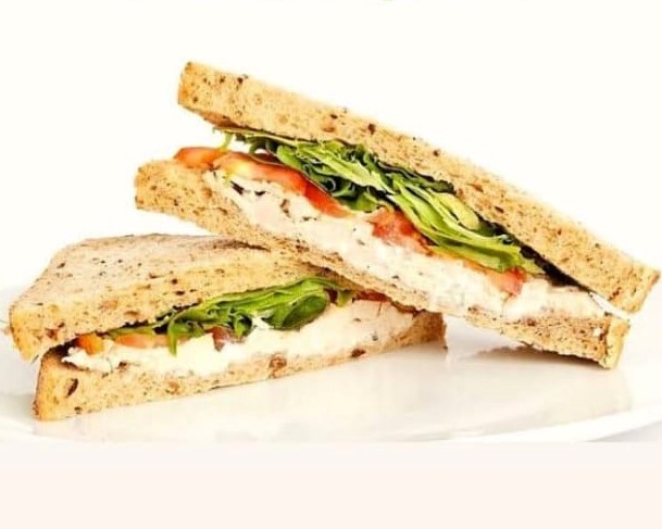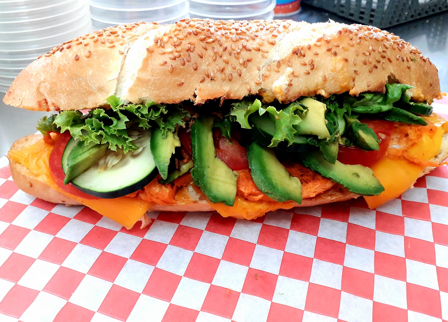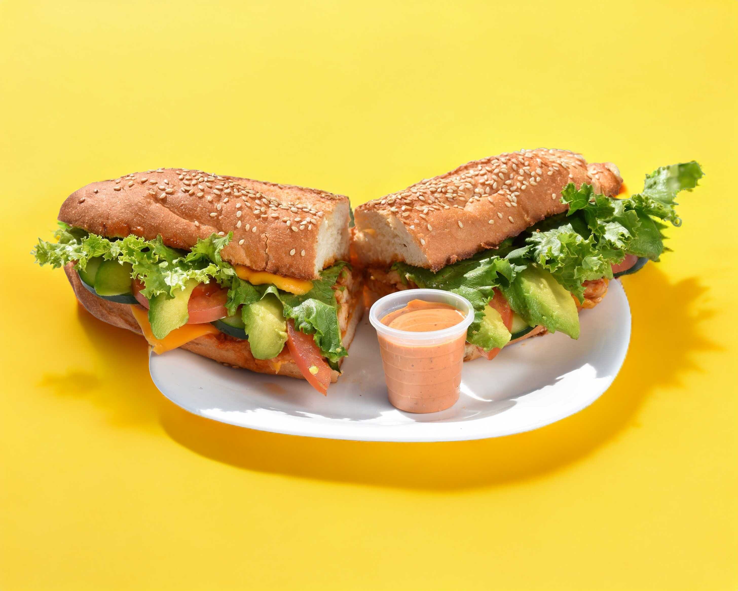 Pechuga de pollo, salsa BBQ o Buffalo y queso amarillo, 3 rebanadas de pepino y tomate, lechuga, mayonesa chipotle.