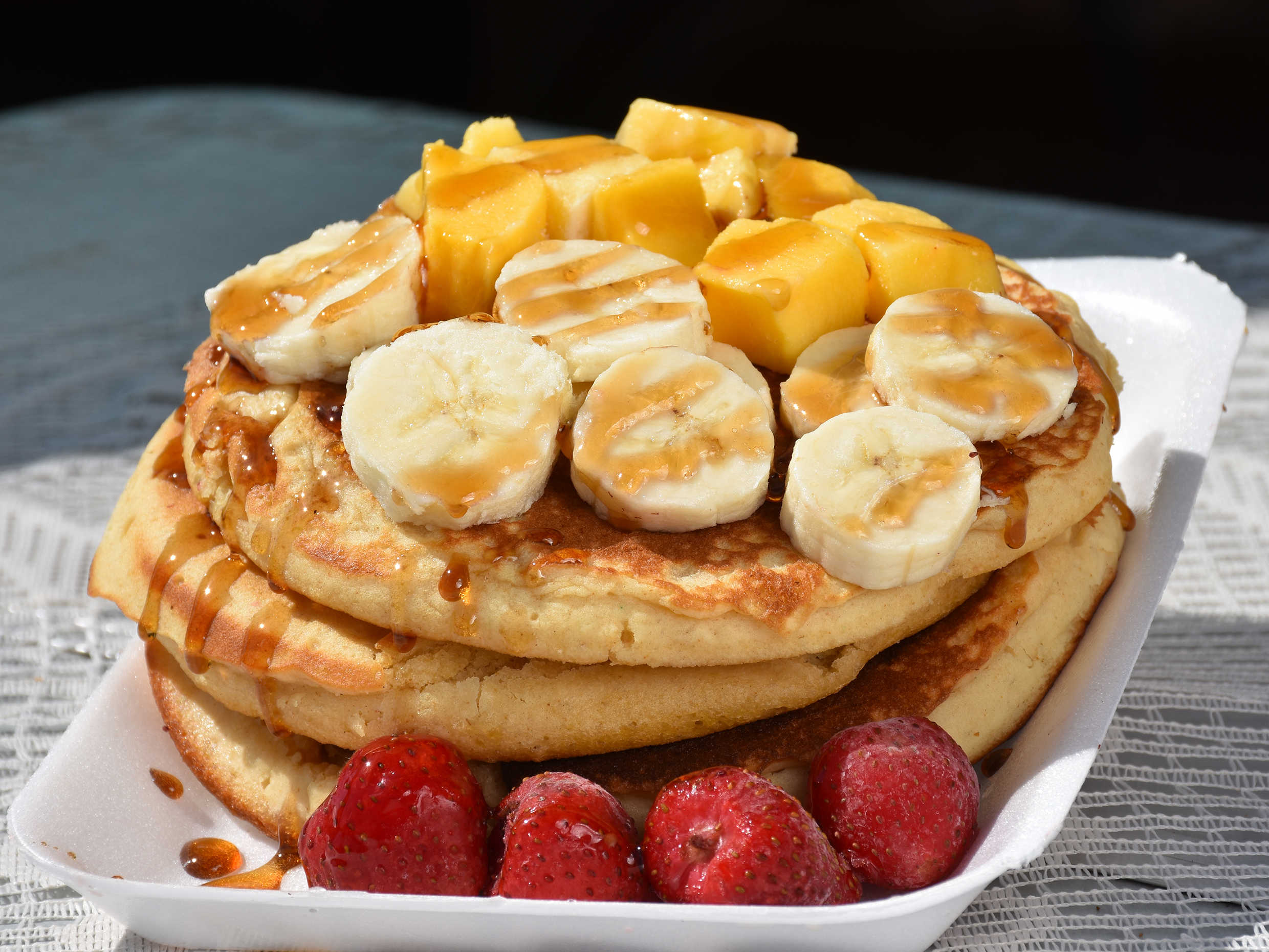 3 ricos pancakes acompañados con fruta de temporada, Nutella , miel o mermelada de fresa