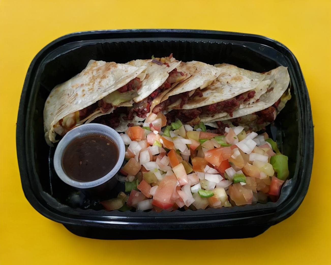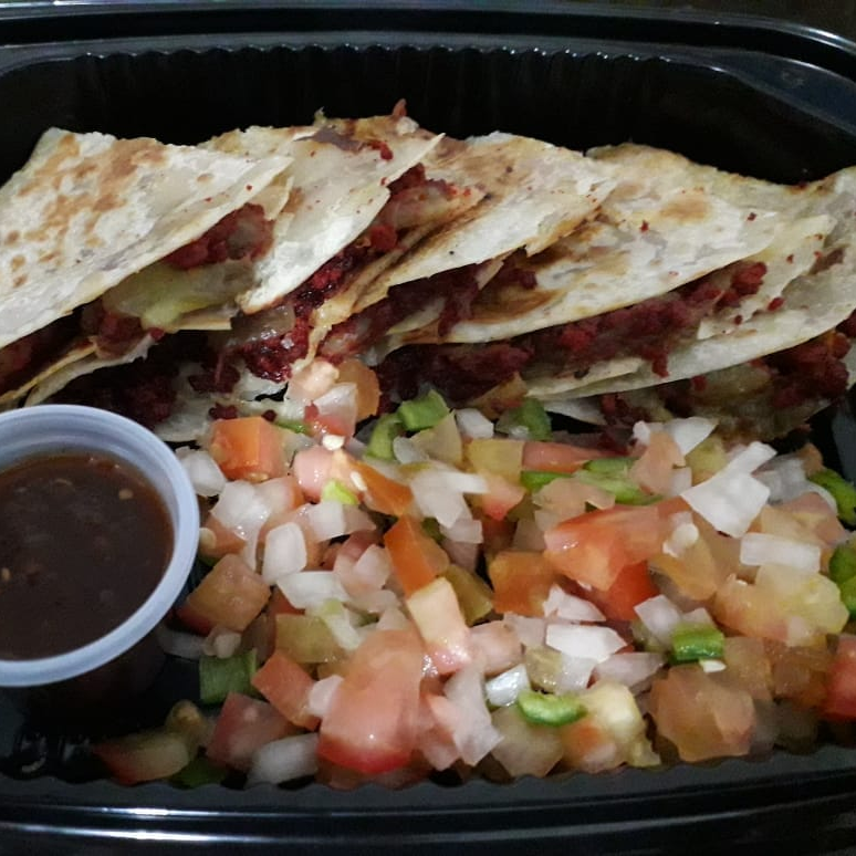 Quesadilla doble acompañada de queso chihuahua, chorizo o jamón, frijoles y salsa bandera o licuada.