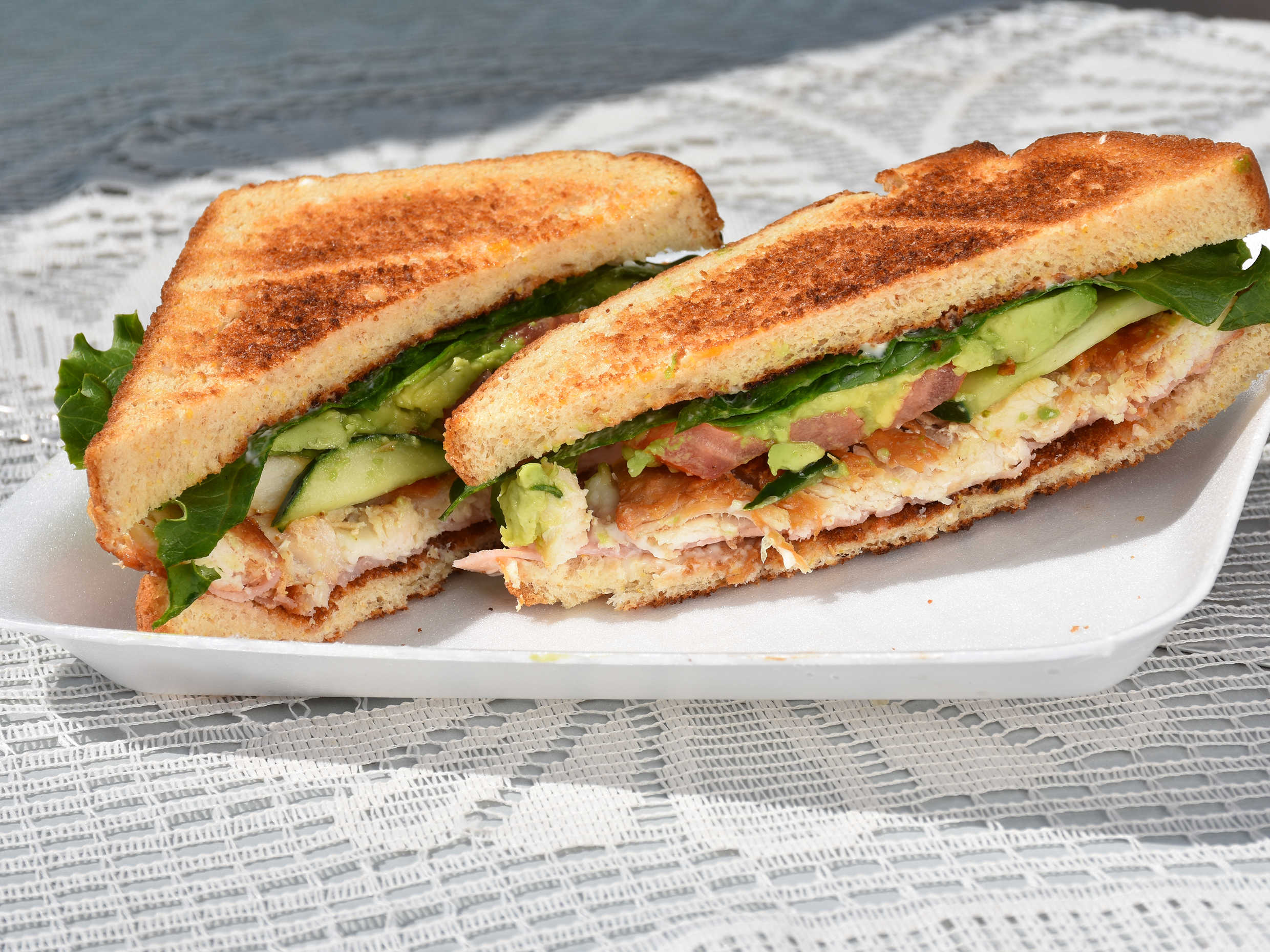 Dos rebanadas de jamón de pavo, queso manchego gratinado, 2 rebanadas de pepino, 1 rebanada de tomate, lechuga y mayonesa, aguacate.