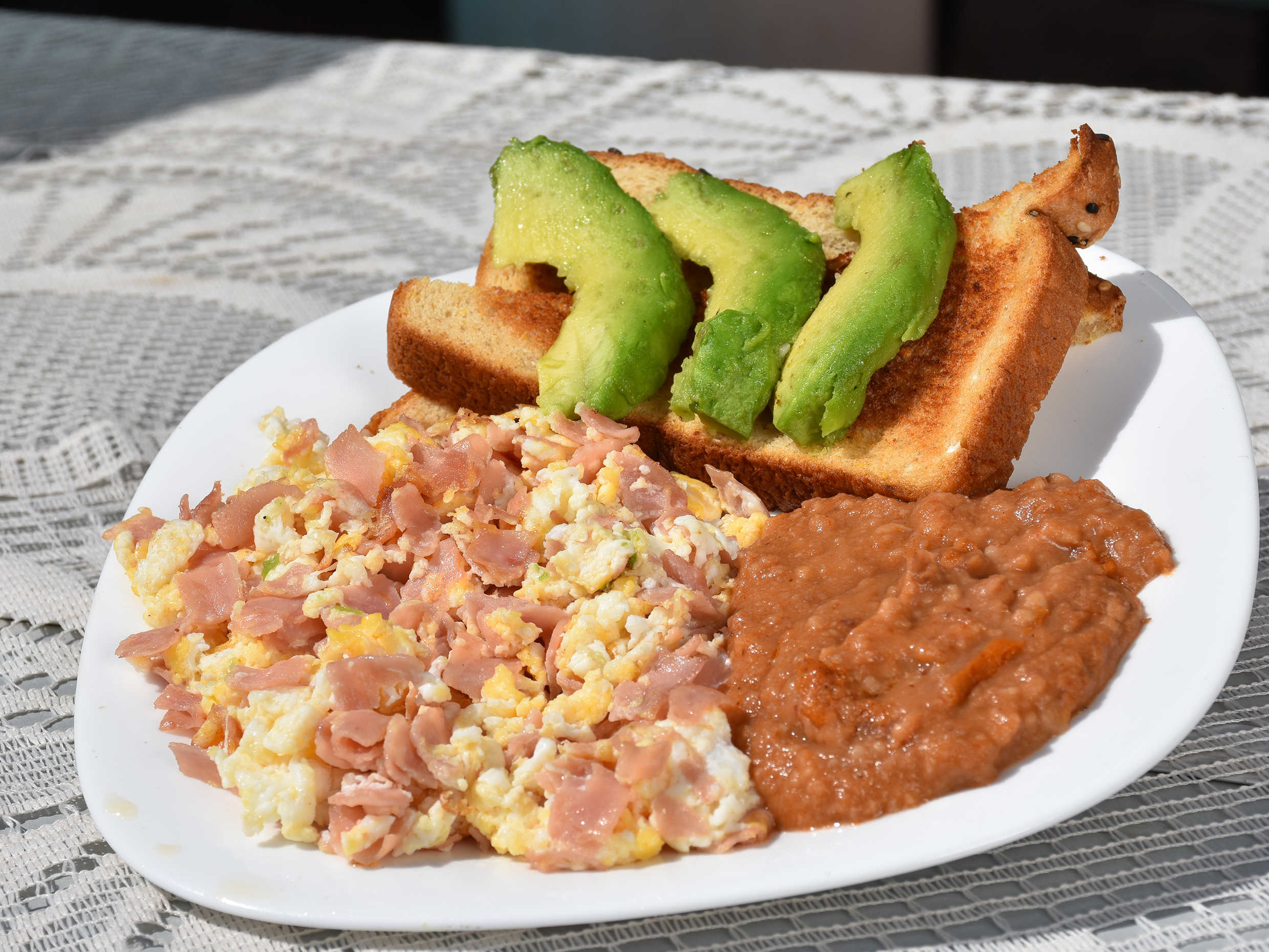 2 piezas de huevo acompañado de frijoles y pan tostado. Ingredientes a elegir: Tocina, salchicha, jamon, espinaca, salsa bandera, chorizo u omellete