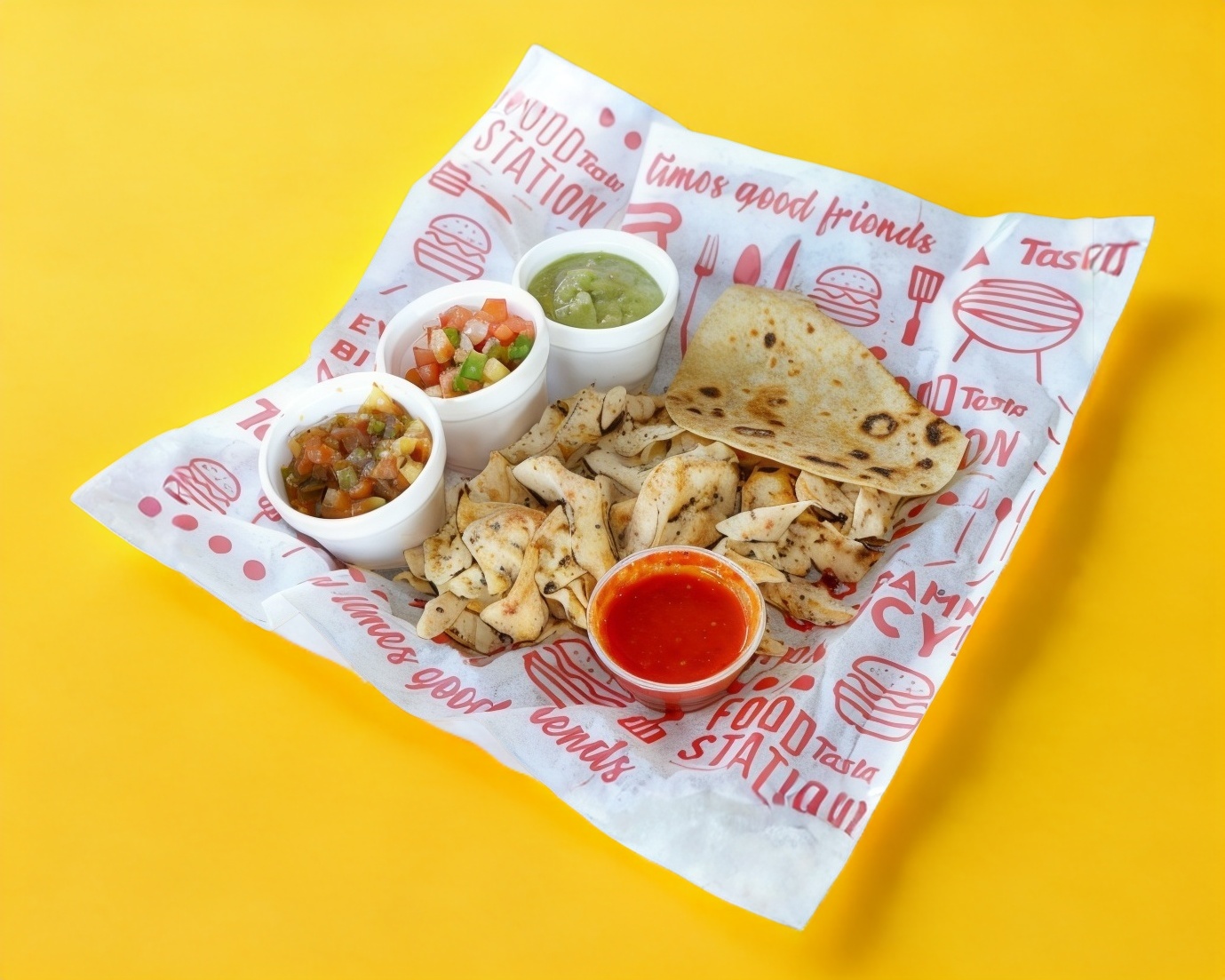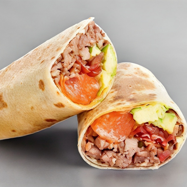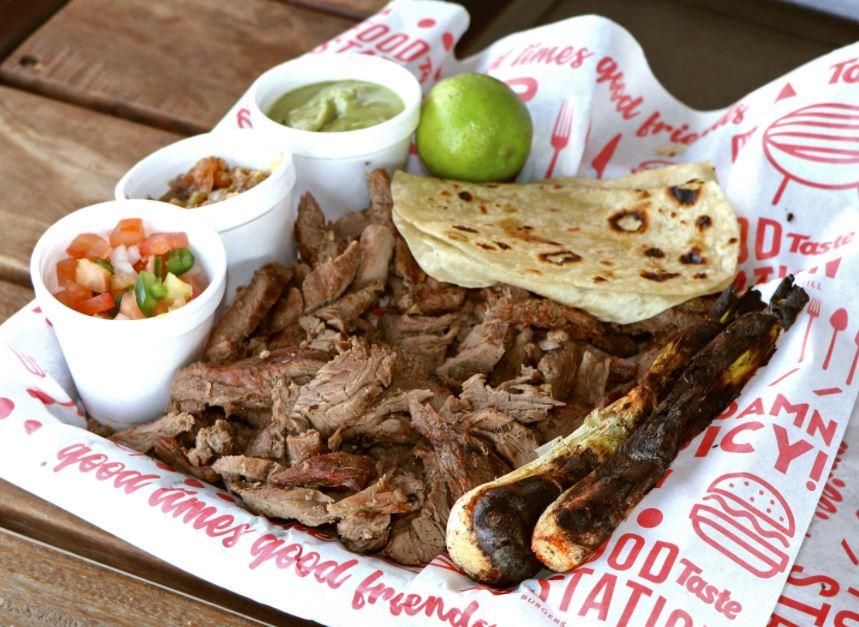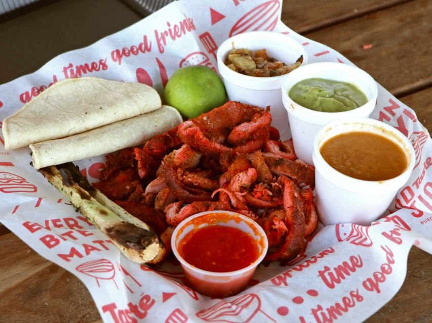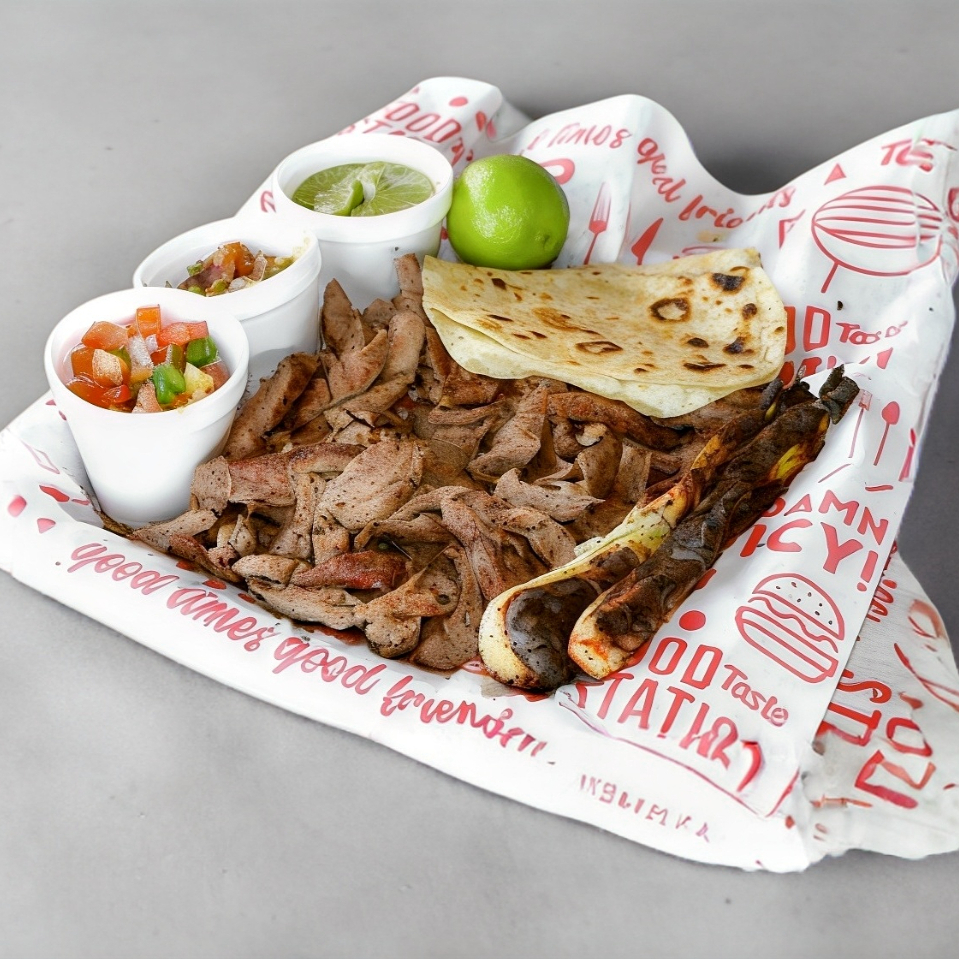 300 grs de carne premium calidad Rancho el 17, mezcla de quesos, tomate, cebolla caramelizada y aguacate en tortilla de harina sonorense con aderezo chipotle, salsa roja y limón