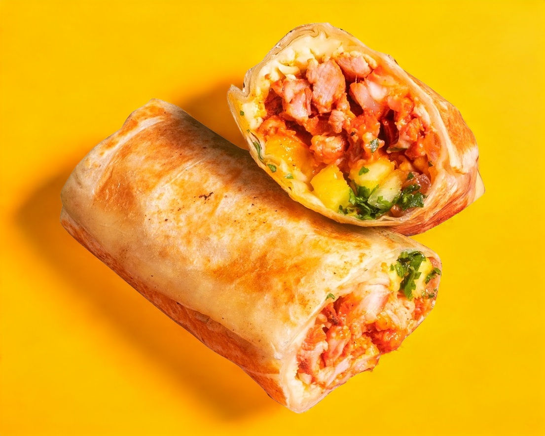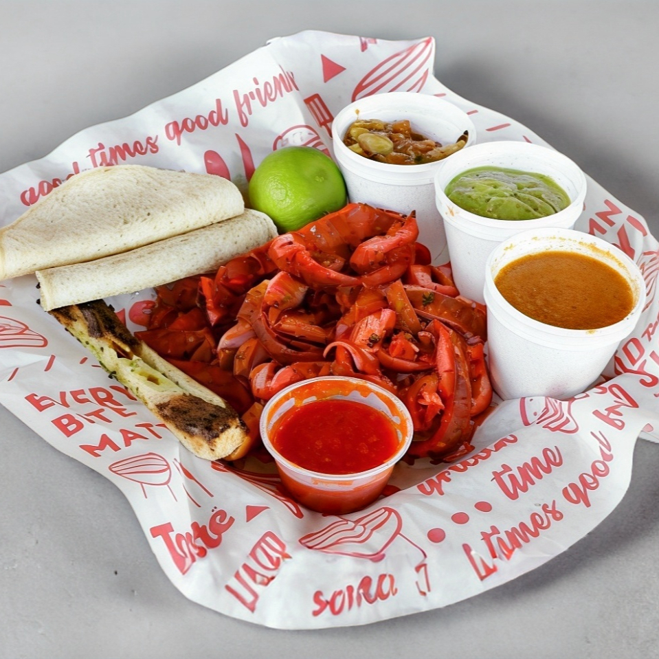 300 gramos de carne al pastor, tortilla sonorense,mezcla de queso mozzarella, cebolla caramelizada, aguacate, trozos de piña, cilantro. Acompañamiento de salsa de chile guerito (caribe), salsas chipotle y media crema.