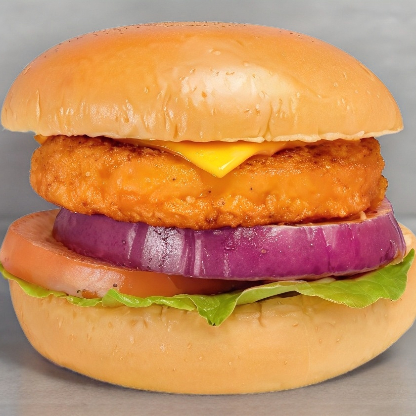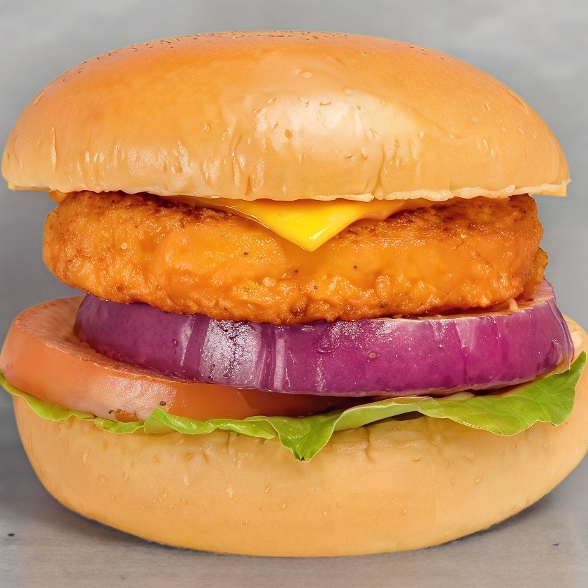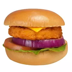 Hamburguesa de pollo crujiente, queso cheddar, lechuga, tomate, cebolla morada y aderezo de la casa