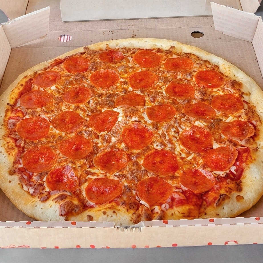 Pizza Pepperoni, masa fresca del día, exquisita salsa de tomate de la casa, queso mozarella y pepperoni